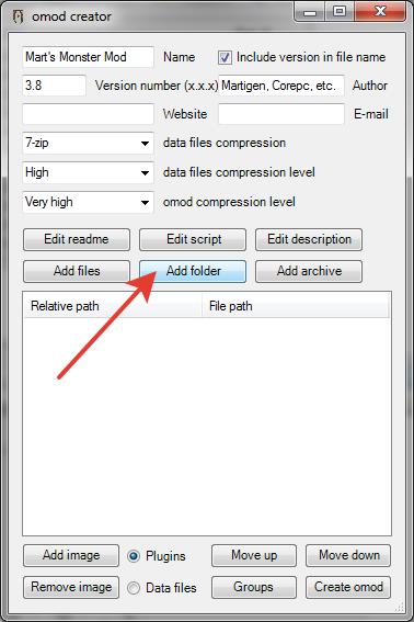 7. В окне [omod creator] нажмите [Add folder] и укажите на папку с "распакованными файлами" из архивов МММ, - подтвердите действие.