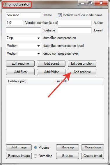 6. В окне [omod creator] нажмите [Add archive] и выберите архив "MMM_OMOD_Installer_1_7.7z",