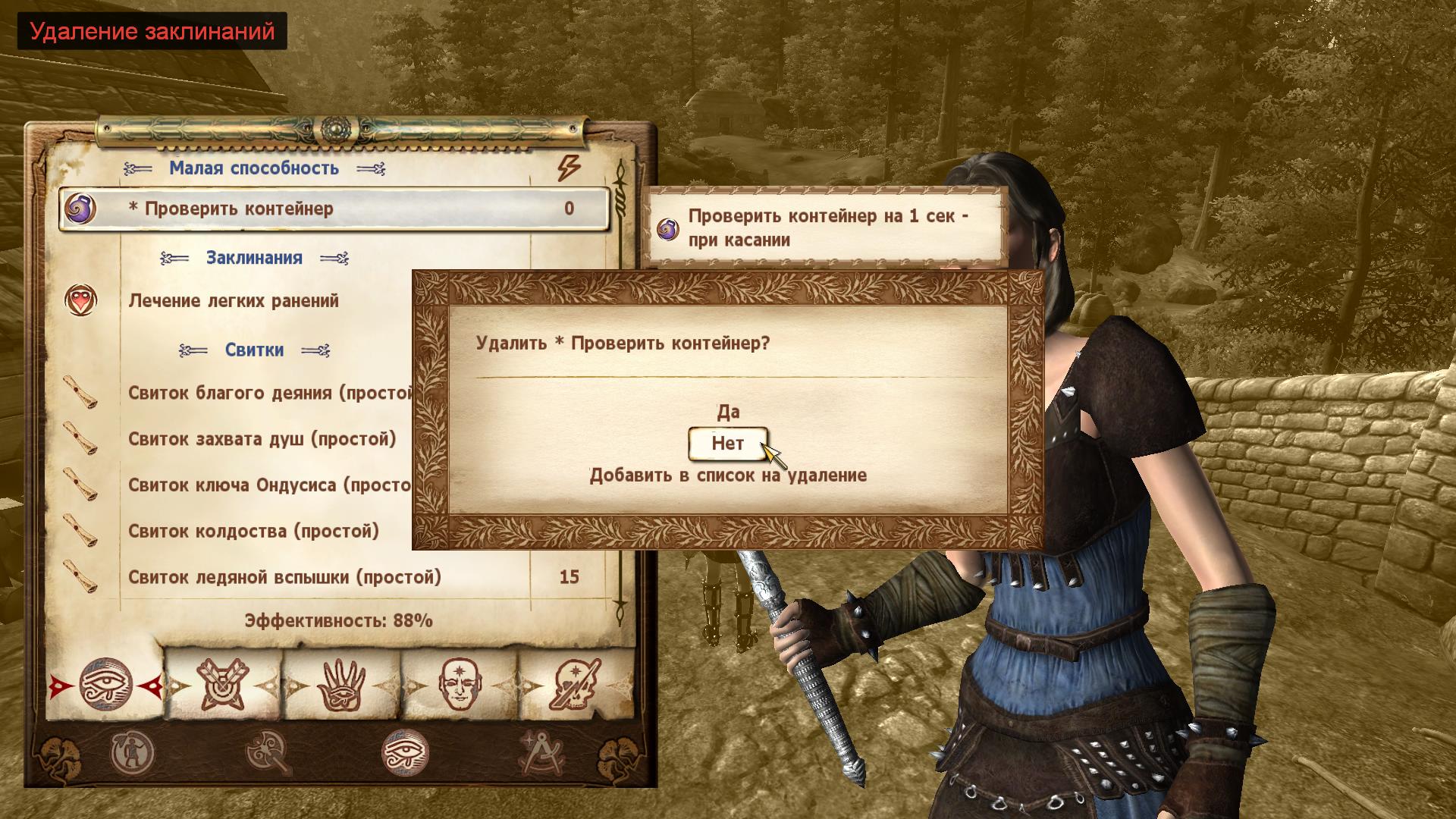 Добавляет возможность удаления ненужных заклинаний. Просто войдите в меню магии, наведите курсор на 'ненужное' заклинание и нажмите 'горячую клавишу' (По умолчанию [Del])