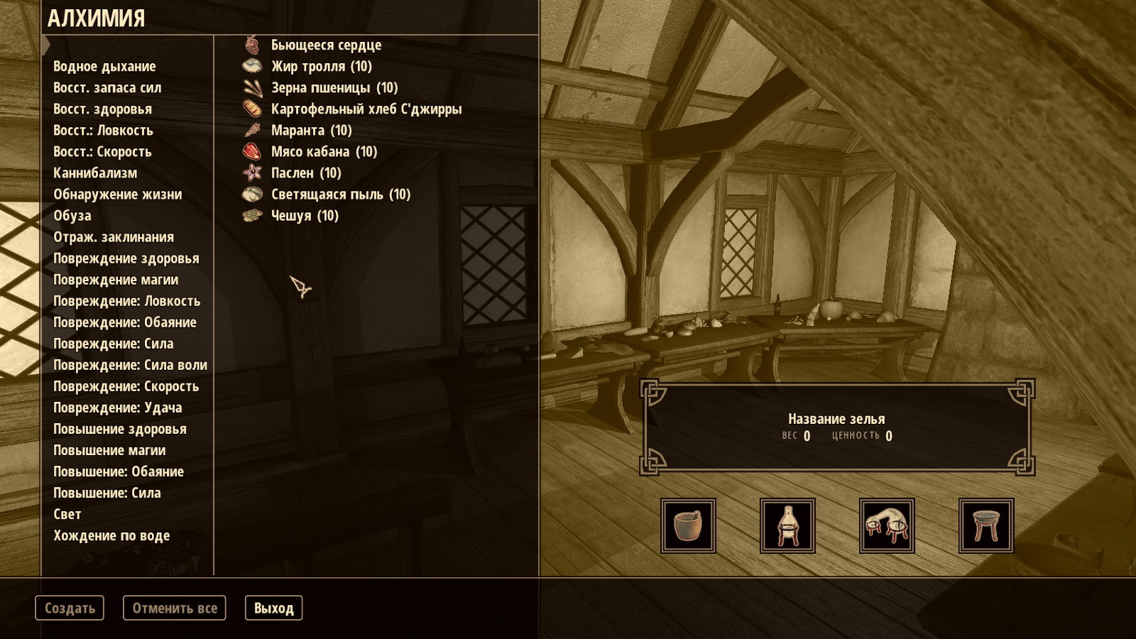 При желании, вы можете заменить ванильное меню Алхимии на меню NorthernUI. Это меню создано по образцу SkyUI и предлагает более удобный процесс при создании зелий и ядов. Новое меню позволяет сортировать ингредиенты по категориям и помогает сразу определить, какие из них можно использовать в данный момент.