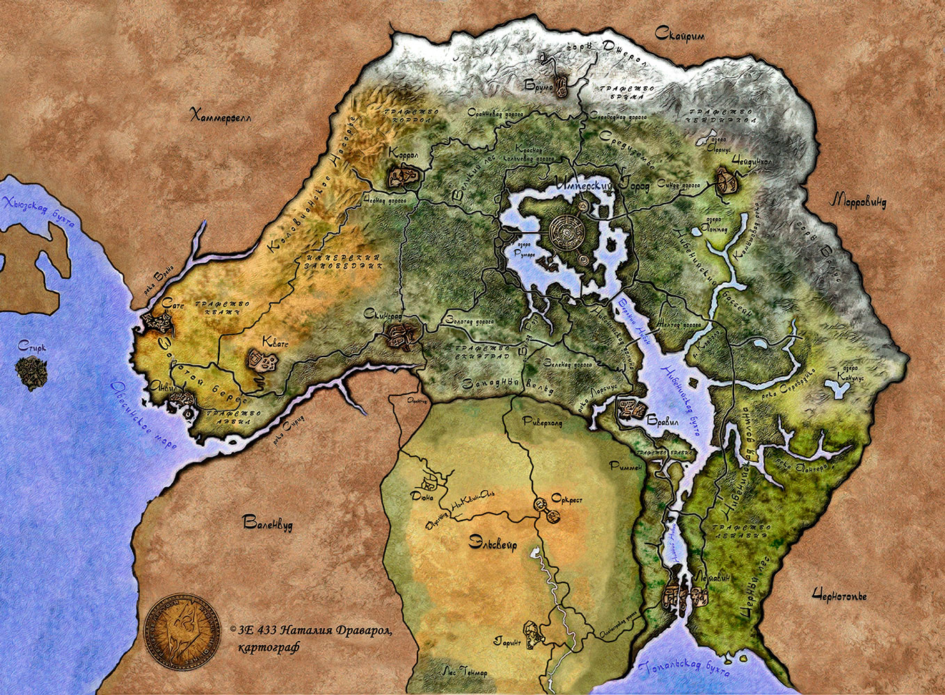 Elven Map Compilation - русифицированный ретекстур глобальной карты от xythen с поддержкой некоторых модов: Stirk, Bartholm, Castle Dunkerlore, Elsweyr, Leyawiin Reborn, New Roads and Bridges, Sutch Reborn, West Roads, Roads of Cyrodiil во всех комбинациях