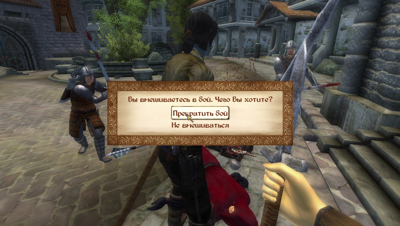 - Сарису можно приказать игнорировать врагов, следуя за Вами, или прекратить начатый бой с дружественными NPC (драться перестанут все участники). Это на случай, если Вы не любитель слезать с лошади каждые пять минут, чтобы выбить дурь из очередного грязекраба. Или если "помощники"из числа стражников и обывателей решили выбить дурь из вас, после того, как сами сунулись под меч Вам или Вашему напарнику.