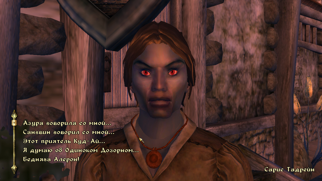 - Сарис различает пол и расу персонажа игрока и комментирует множество квестов оригинальной игры: чем больше заданий Вы начали\закончили, тем больше тем для разговора у вас будет. Наличие чувства юмора, как всегда, приветствуется.