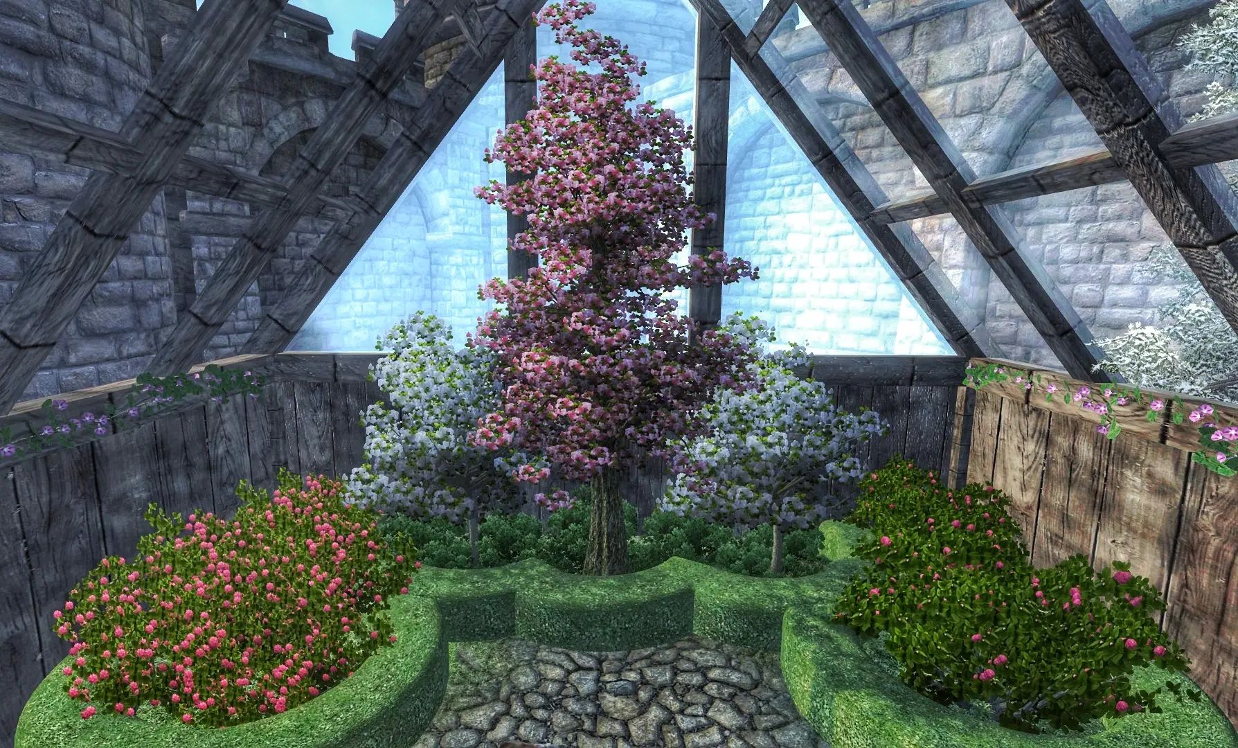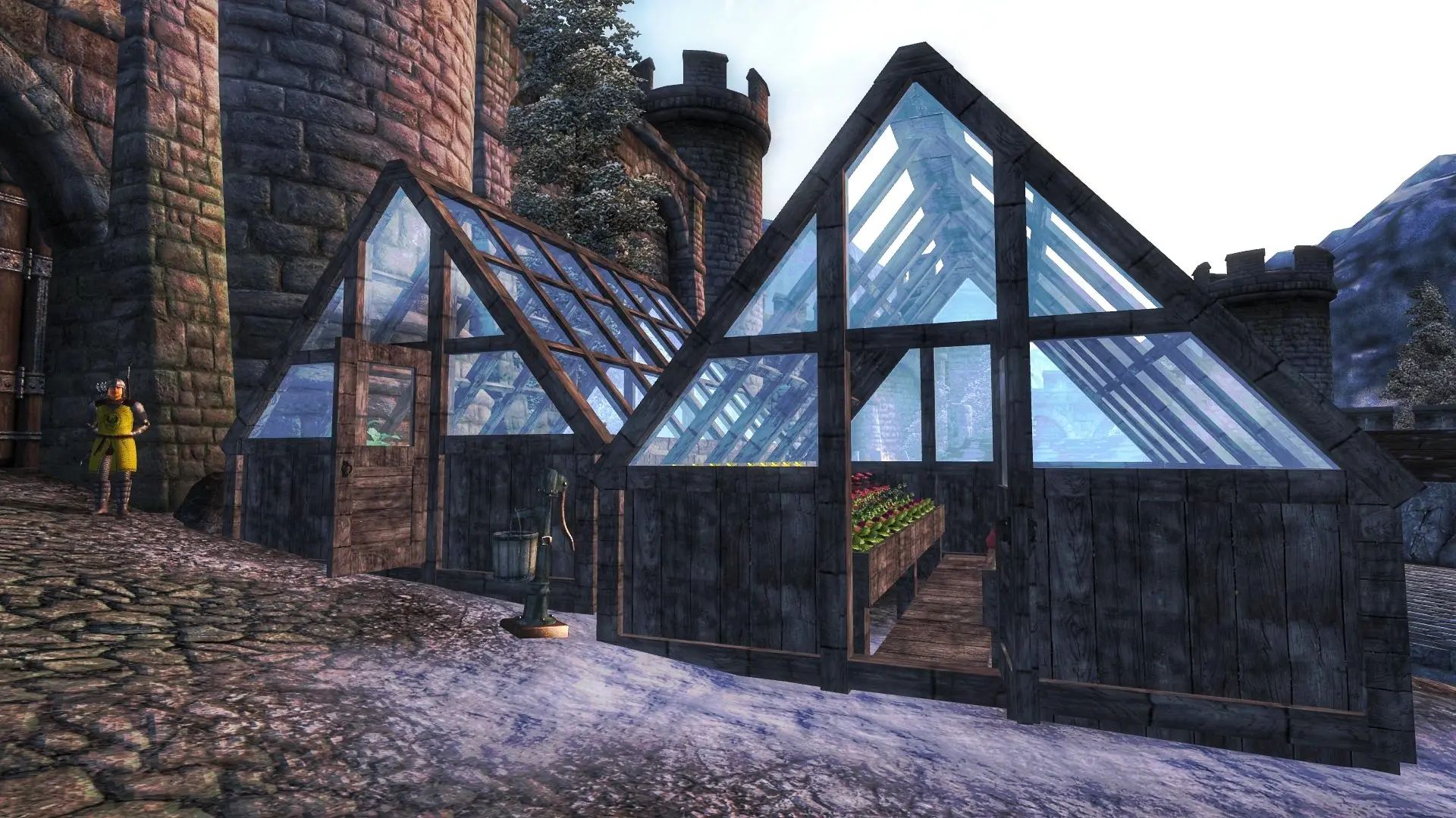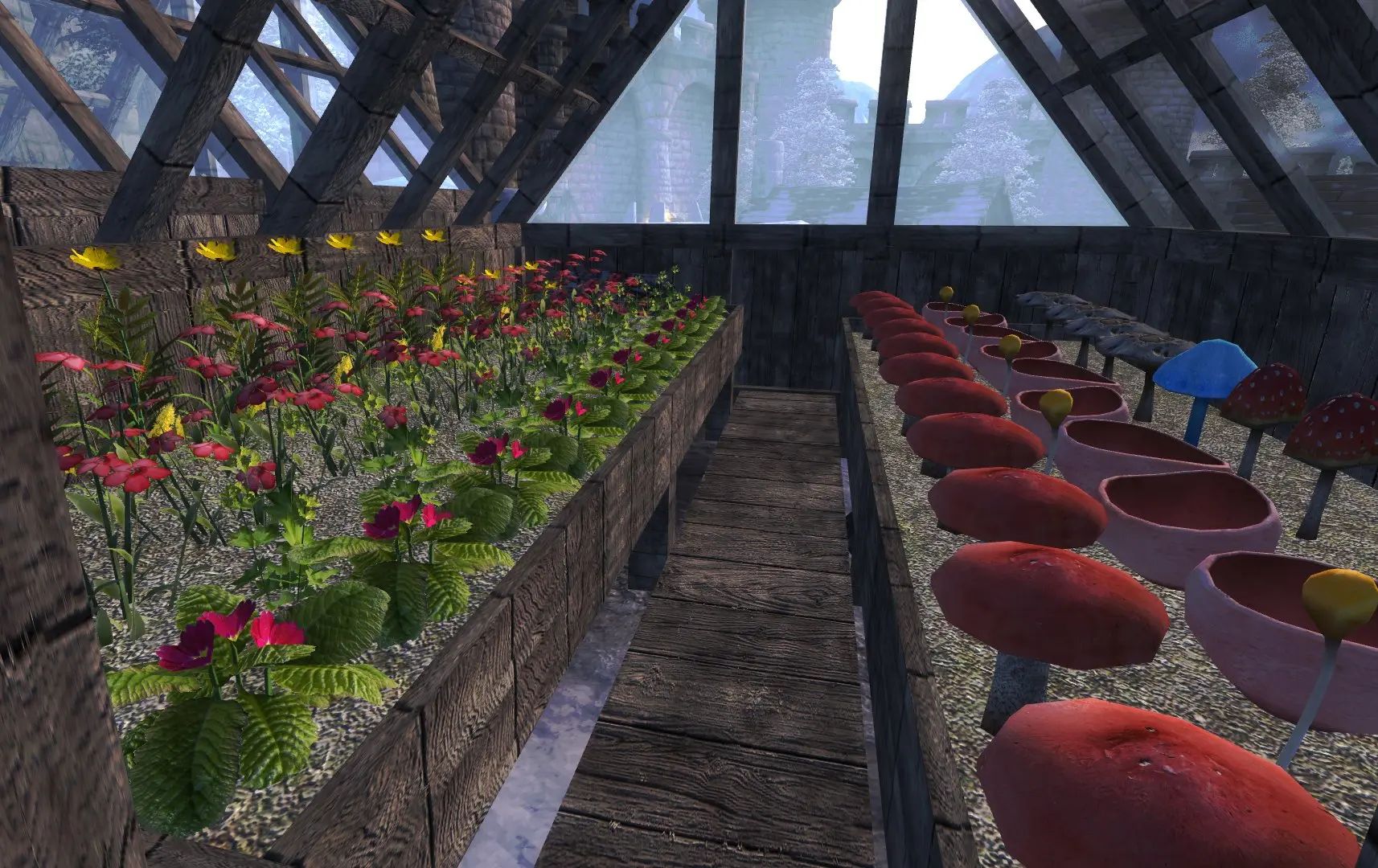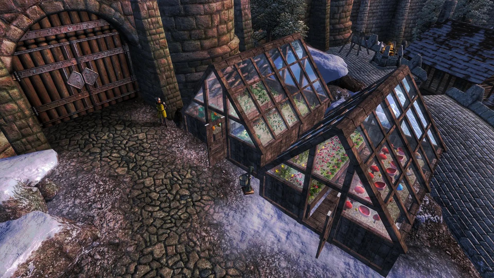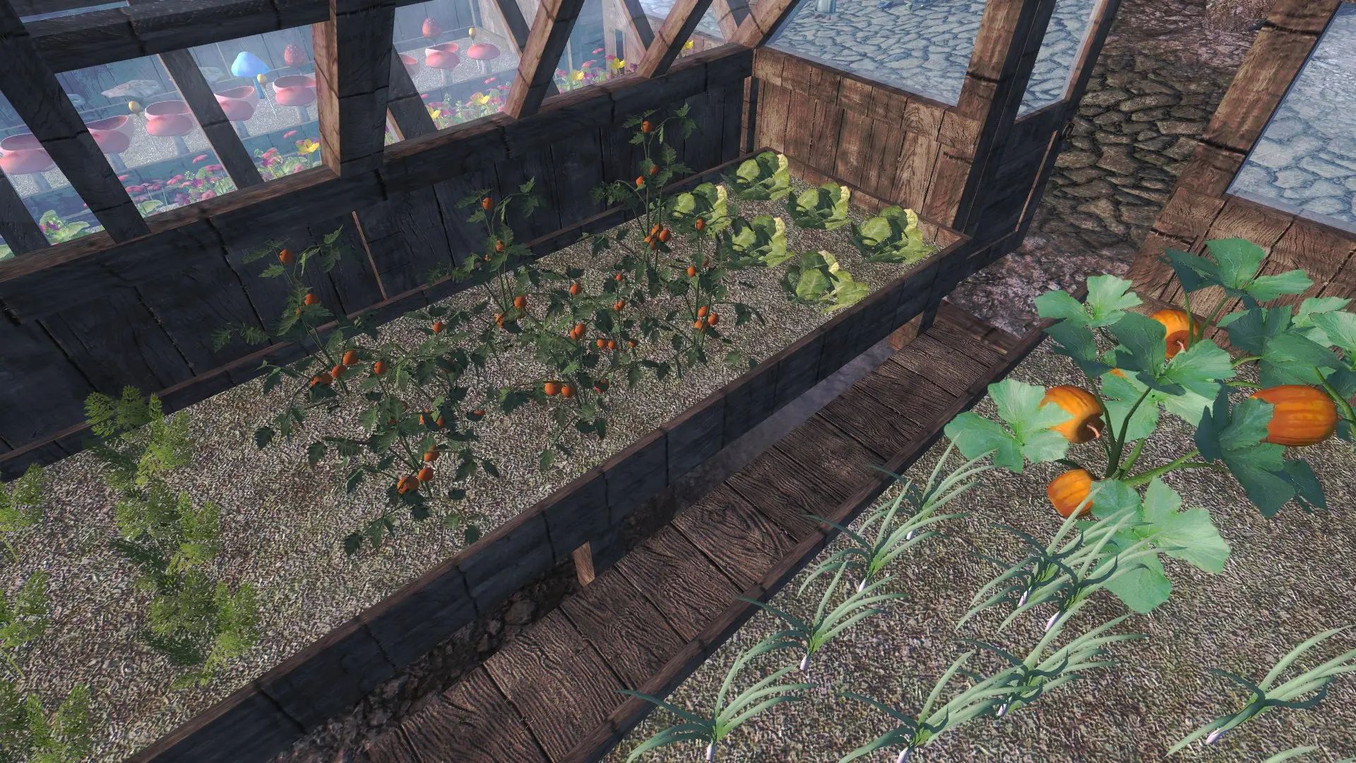Теперь даже у вечно холодной Бруме есть сады! Я добавила три теплицы: две у Северных ворот, одну во дворе замка. Две рядом с воротами служат «общественными садами», где каждый может выбрать то, что им нужно: одна для еды (овощи), вторая для алхимических ингредиентов (цветы и грибы).