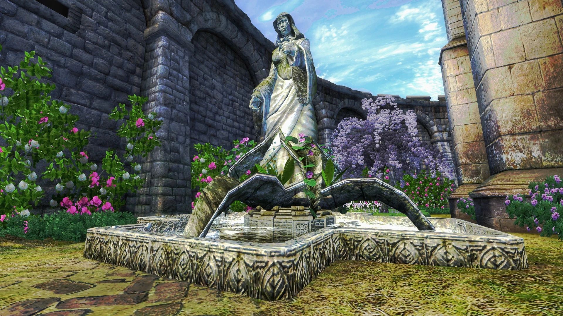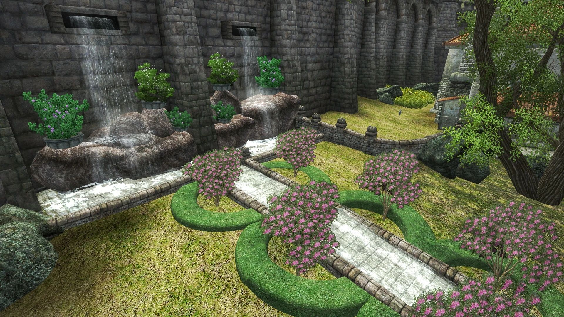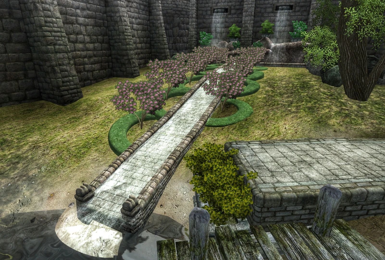 Теперь Анвил действительно достоин стать домом культа Дибеллы, богини красоты и искусств! Я добавила два сада: один принадлежит часовне в честь богини (где в оригинальной игре есть её статуя), другой представляет собой живописный фонтан, соединённый с прудом у статуи Русалки водным каналом, обрамлённым миртовыми деревьями (мирт в древнегреческой мифологии ассоциируется с богиней Афродитой, которая во многом похожа на Дибеллу).