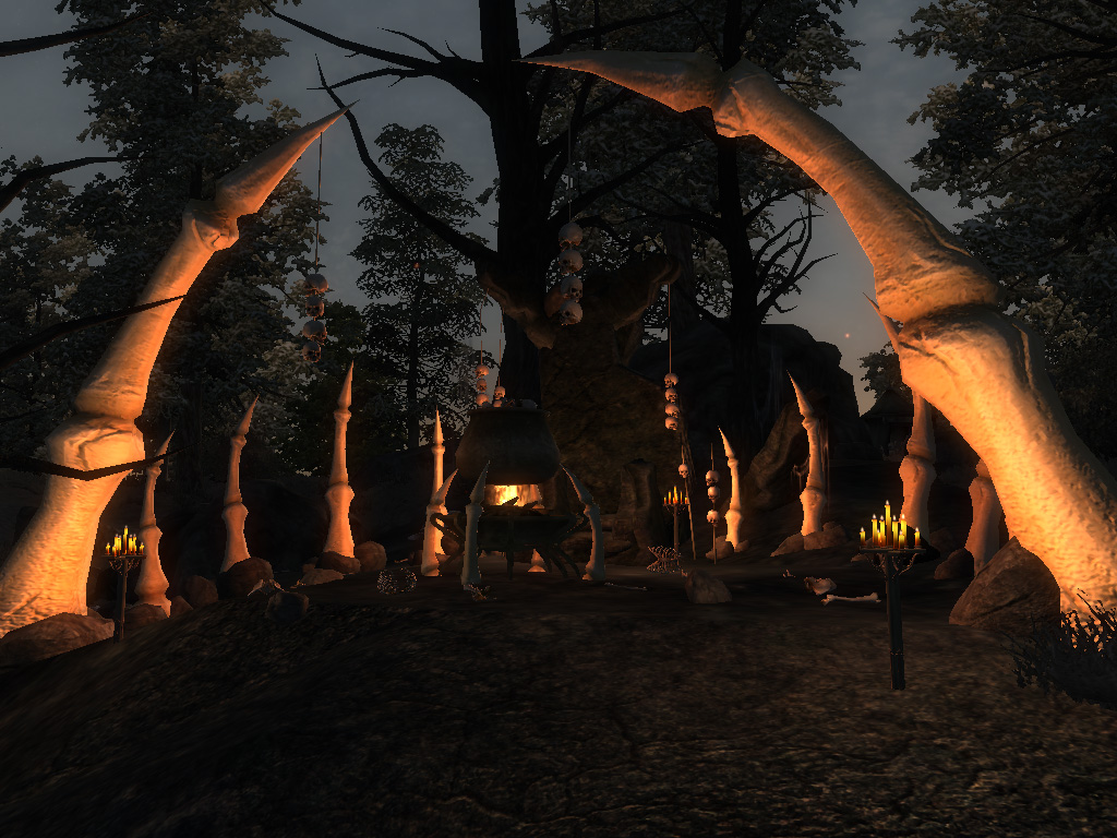 Но по слухам, высоко в горах Валус к юго-востоку от Чейдинхола еще недавно действовал один из таких шабашей. К сожалению, сейчас он опустел, когда ведьмы ушли, они забрали с собой все подчистую, ничего не оставив искателям сокровищ. Но это жуткое место все еще представляет интерес для туристов и ученых, изучающих историю ведьмовства Тамриэля.