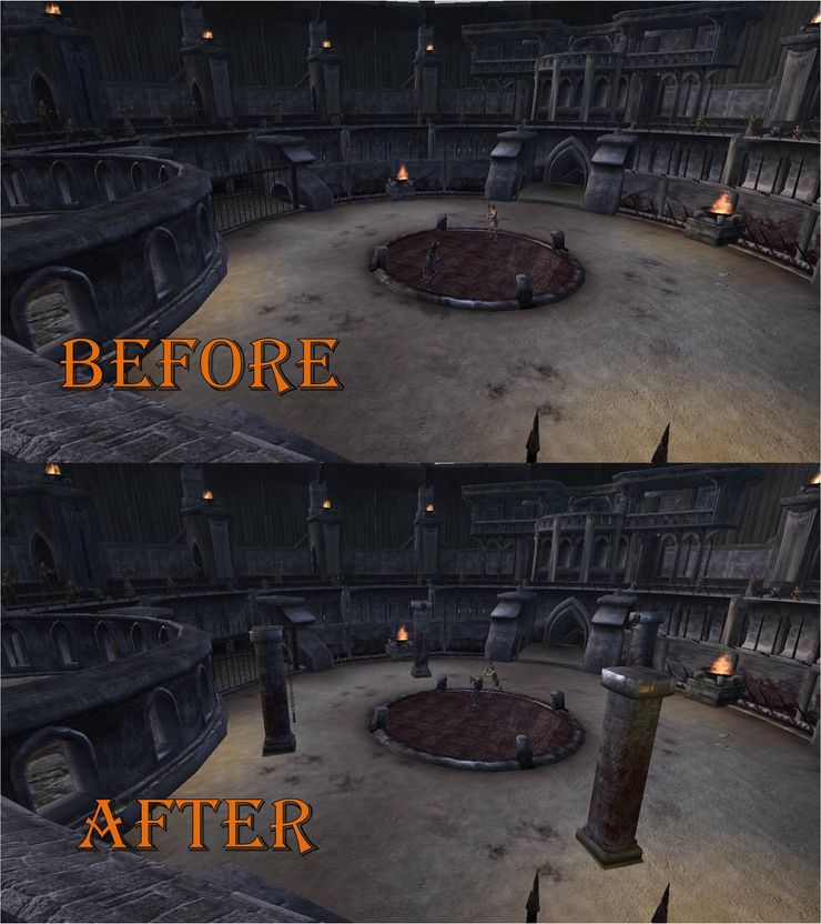Этот небольшой мод исправляет недочёт разработчиков - добавляет четыре недостающие колонны с цепями на арену, где ГГ является зрителем, которые, тем не менее, присутствовали на арене, где ГГ - гладиатор. Теперь арена для ставок и арена для боёв кажутся действительно одним и тем же местом!