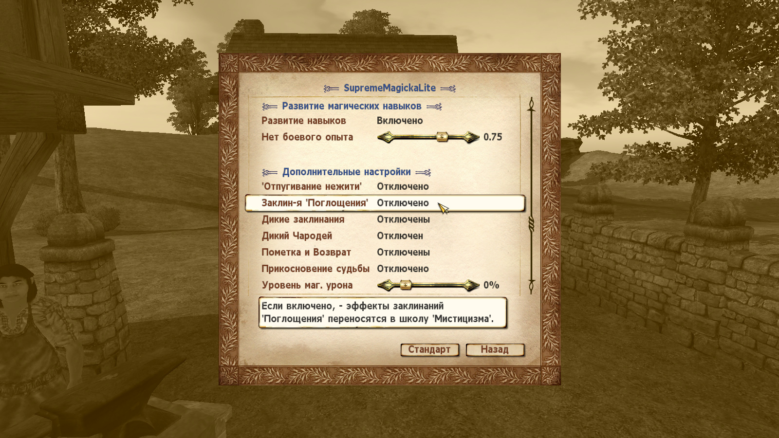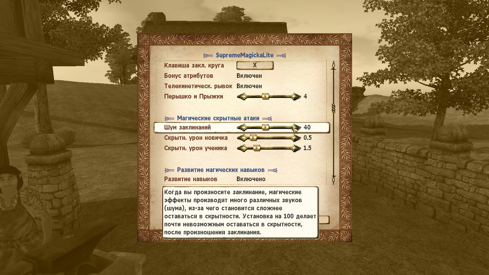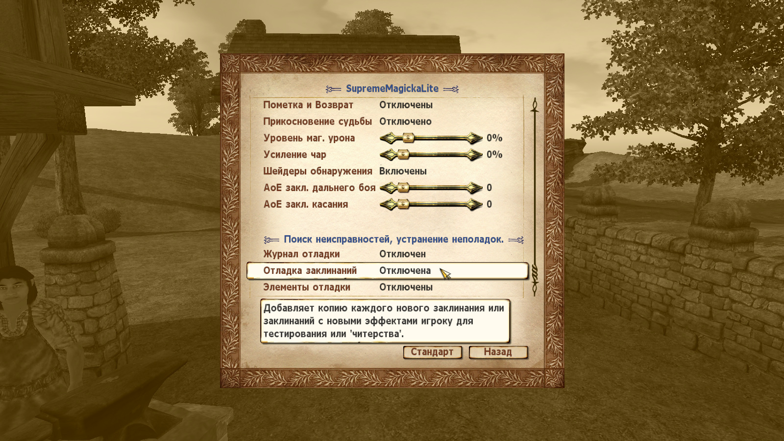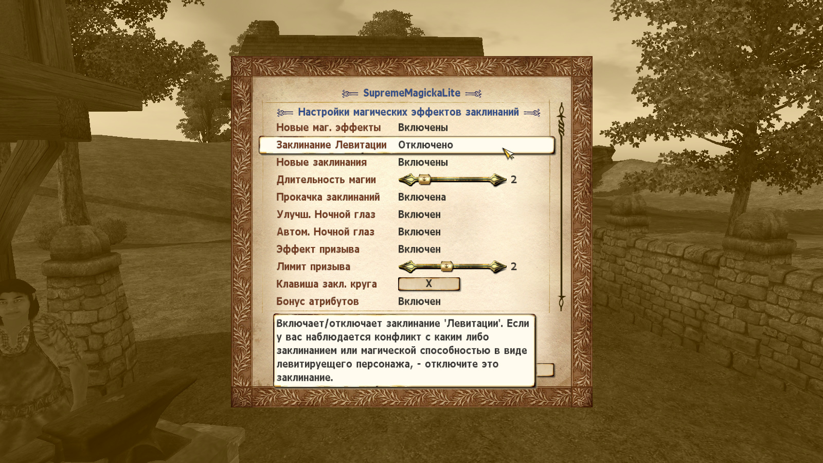 Вы можете использовать SupremeMagickaLiteSettings.ini - файл дополнительных настроек игры, как способ изменить любые официальные настройки игры Oblivion, если вы того пожелаете. Некоторые очевидные опции указаны в качестве примеров, но изначально отключены.(ознакомьтся с описанием функций, вы можете непосредственно в самом ini-файле ).