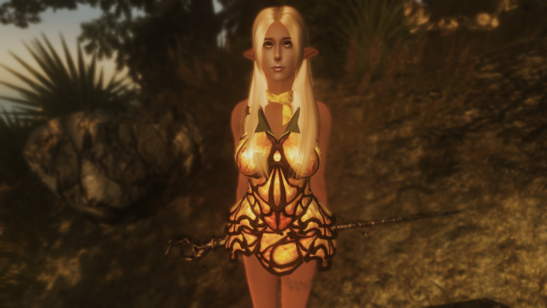 В игре раса называется «Незнакомка», потому что выглядит нелорно и может быть как с эльфийскими ушами, так и с человеческими: всё зависит от вашего выбора. Поддерживает только женских персонажей, так как мне лень работать ещё и над мужской моделью. Для парней есть свои собственные отличные расы.