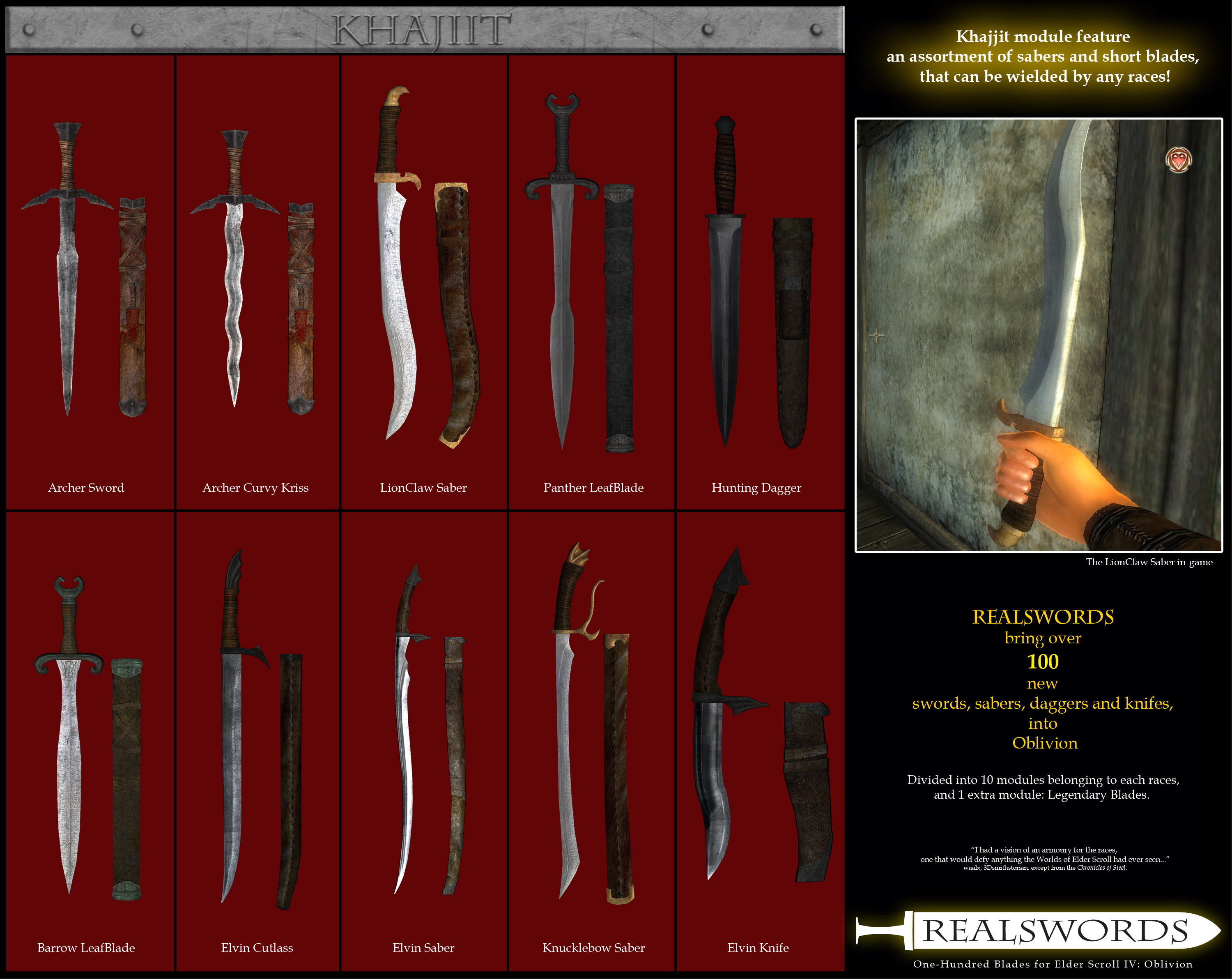 Серия плагинов Real Swords наделяет собственным оружием расы Обливиона, при использовании его представителем расы у него добавляется бонус, разный в каждом случае.