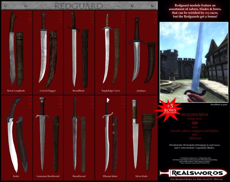 Серия плагинов Real Swords наделяет собственным оружием расы Обливиона, при использовании его представителем расы у него добавляется бонус, разный в каждом случае.