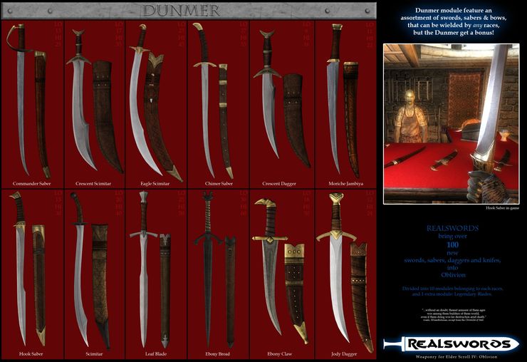 Серия плагинов "Real Swords" призвана разнообразить ассортимент оружия Обливиона новыми мечами, саблями, кинжалами, луками, стрелами и т.д. Каждый модуль серии отвечает за свою расу, привнося в игру характерное для нее оружие и добавляя ей бонусы при его использовании. Данный релиз добавляет оружие расы данмеров.