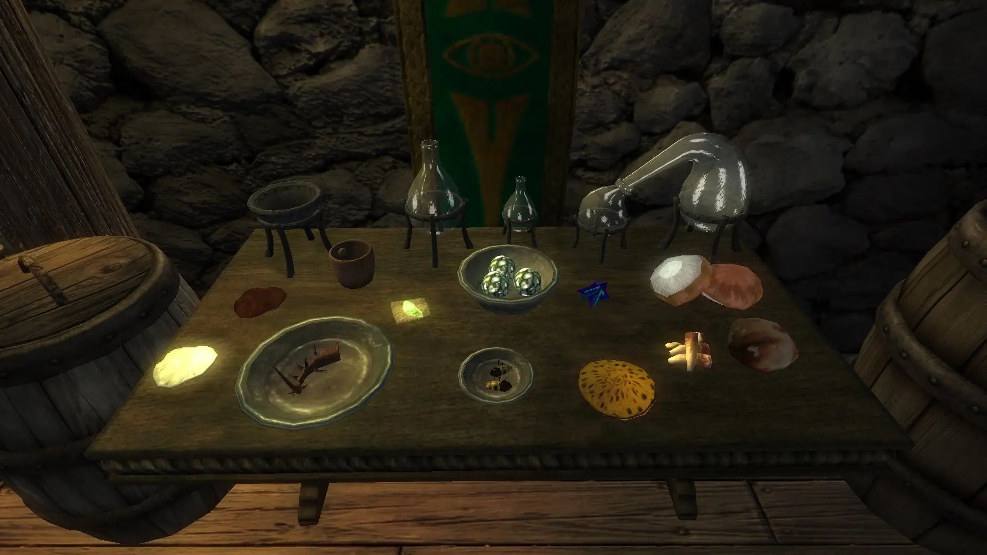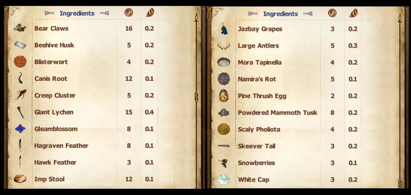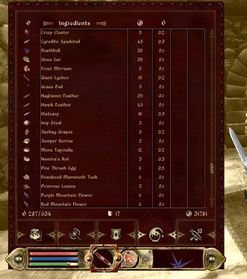 Этот мод добавляет ингредиенты из TESV: Skyrim в Oblivion. Вы можете найти алхимические ингредиенты для покупки у Селены Орании или Сууротана в Бруме или в Позолоченном Графине в Имперском городе. Вы найдете съедобные ингредиенты, такие как соляные кучи и куриные яйца, в продаже у продавцов продуктов питания и в случайных местах. Некоторые продавцы также продают напитки и/или сыры из Скайрима. Вы также можете приготовить определенные блюда, используя кастрюлю или вертел. Несколько предметов были добавлены в качестве трофеев, которые можно получить от существ.