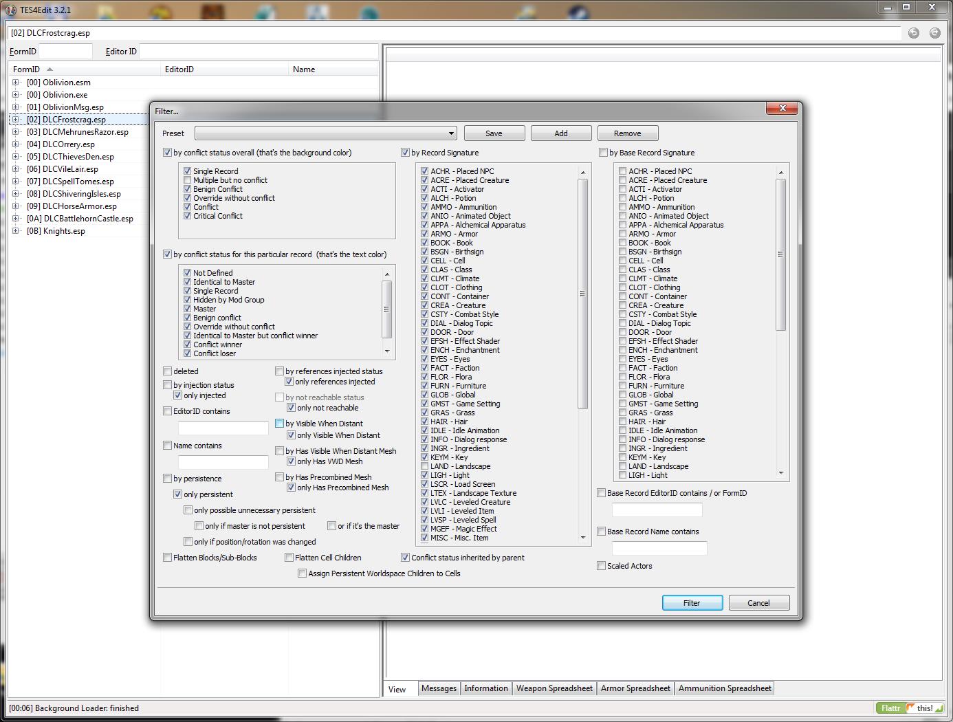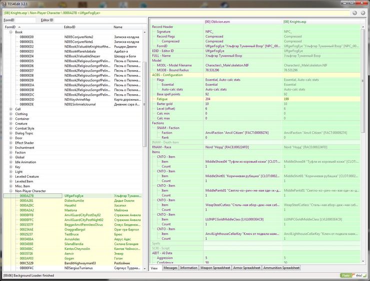 TES4View and Edit - программа, которая умеет определять конфликты в плагинах и исправлять их. Речь идет о несовпадении переводов - отмечается разница в версиях между плагинами и игрой например. Самое важное - это исправляется тут же. Программа умеет редактировать имена, диалоги и все кроме скриптов. Большие фразы и книги ей недоступны потому что она не принимает более 256 знаков в поле. Но для быстрого исправления ошибки в именах, сверки с игрой или другим своим же преводом, быстрого доступа к заголовкам всего, показываемого в игре - это большой плюс. Вы сразу видите где игровой контент, а где - неигровой, то есть программа сильно облегчает переводы.
