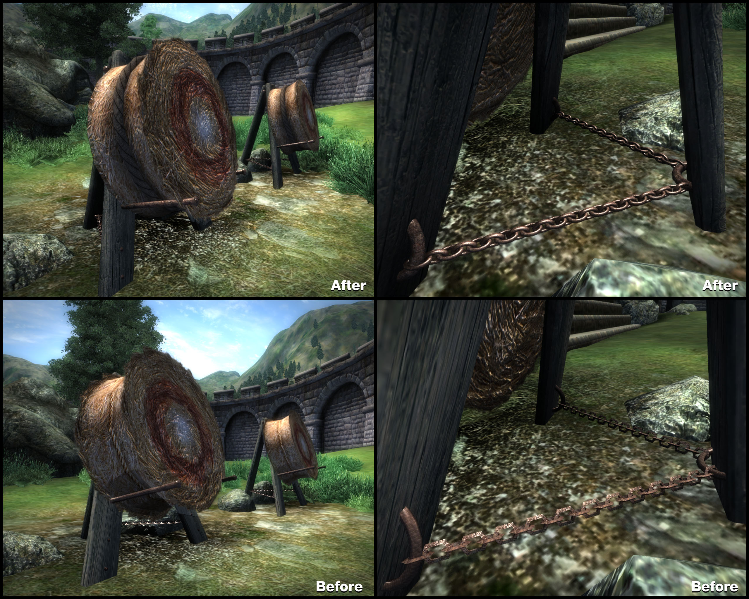 Mesh Improvement Project - хороший проект по исправлению и улучшению многих моделей игрового мира Обливиона, но к сожалению при его создании автор модификации сам допускал некоторые ошибки. Сам я разумеется ничего не исправлял (нет таких навыков пока что), просто нашел несколько модификаций, которые почти всё правят, удалил из мода реплейсер серебряного оружия (и зачем, спрашивается, было удалять черные вставки, это ведь точно не ошибка), проапскейлил все текстуры мода и закинул все, что получилось в один архив.