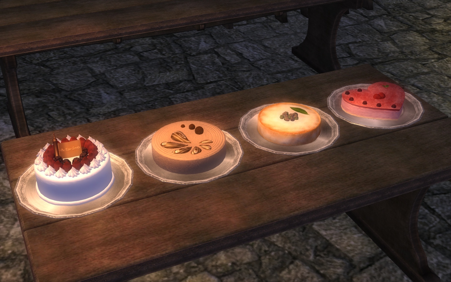 От переводчика: Я добавила пирожные в столовые замков Чейдинхола, Брумы и Бравила, и одно - в главный зал замка Анвила. Кроме того, пирожные есть в тестовом зале. Приятного аппетита!