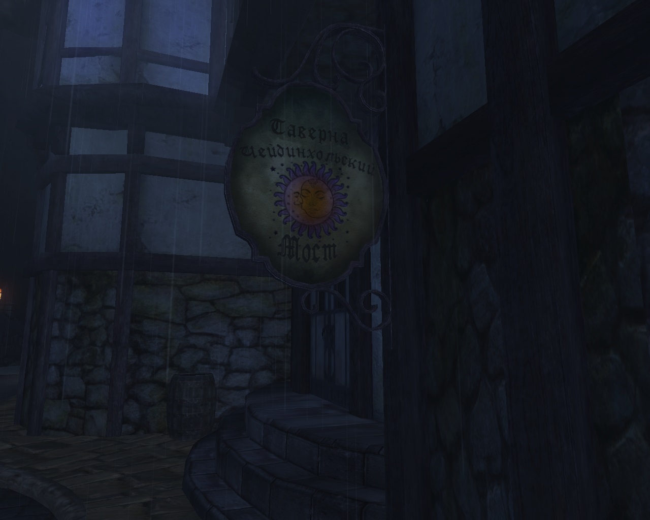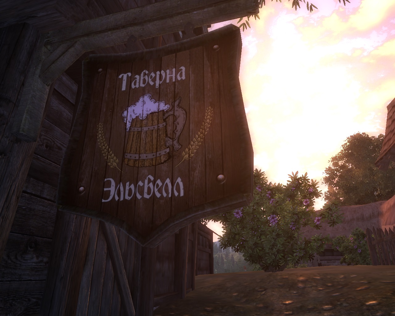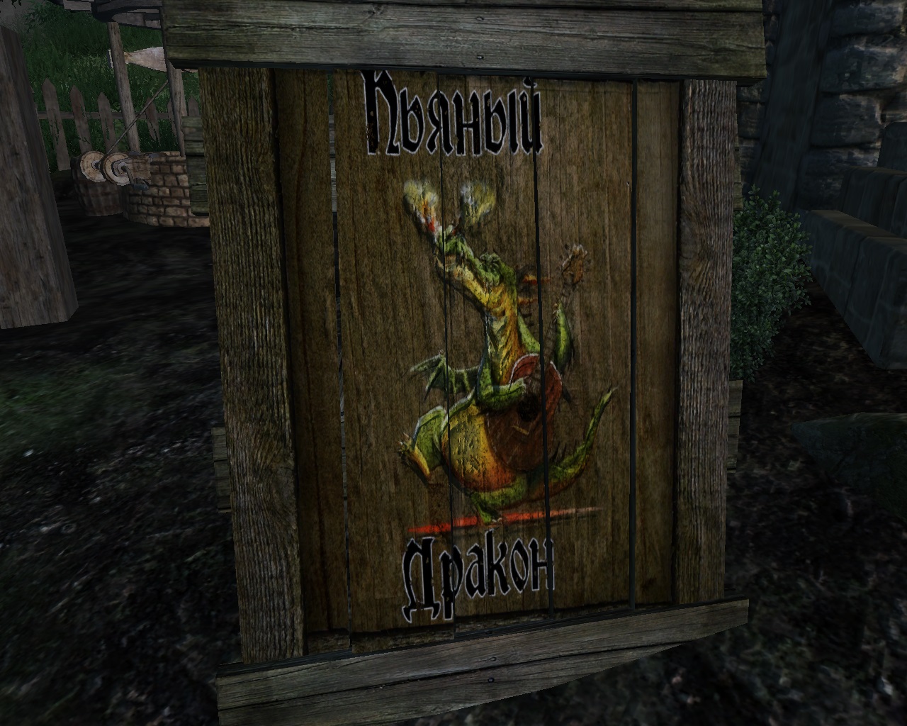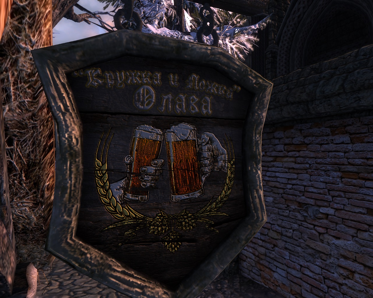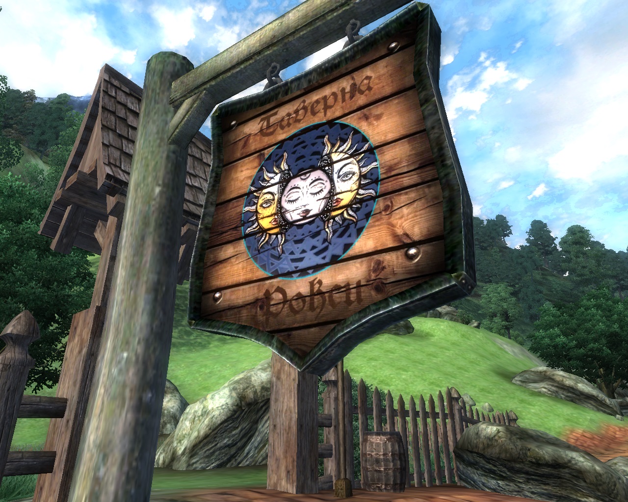 В архиве "Retextured Inn Signs(RUS)" -русский текст вывесок, помимо основного архива присутствует опциональный который добовляет вывеску таверне "пограничной заставы".