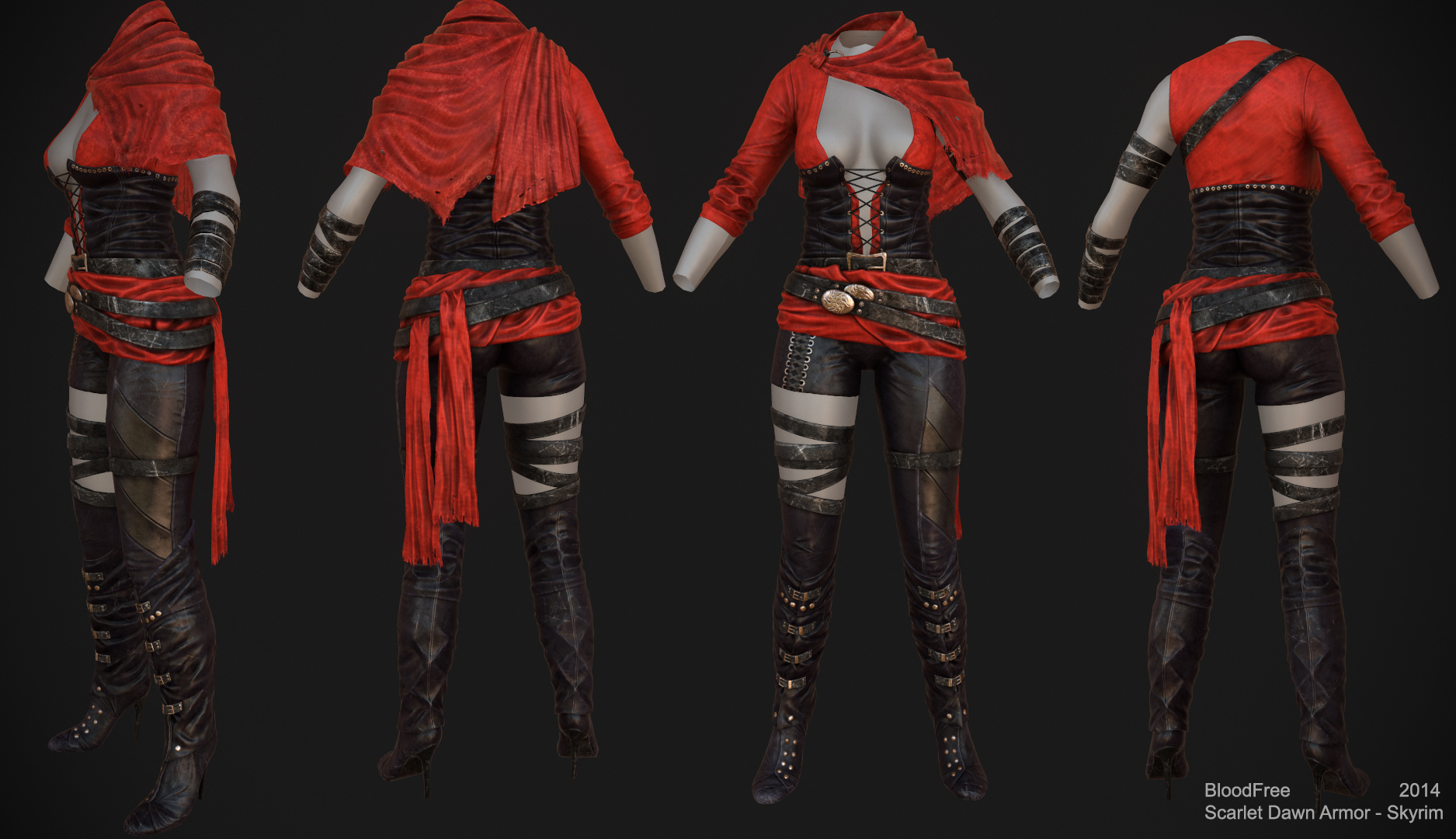 Scarlet Dawn Armor (доспехи "Алый рассвет") - качественный сет женской брони/одежды с текстурами в HD качестве и поддержкой "физики". Одежду можно изготовить в кузнице, в разделе "Кожаное". Можно улучшить и зачаровать. Сет состоит из брони, сапог, платка, бандажа и относится к лёгкой броне.