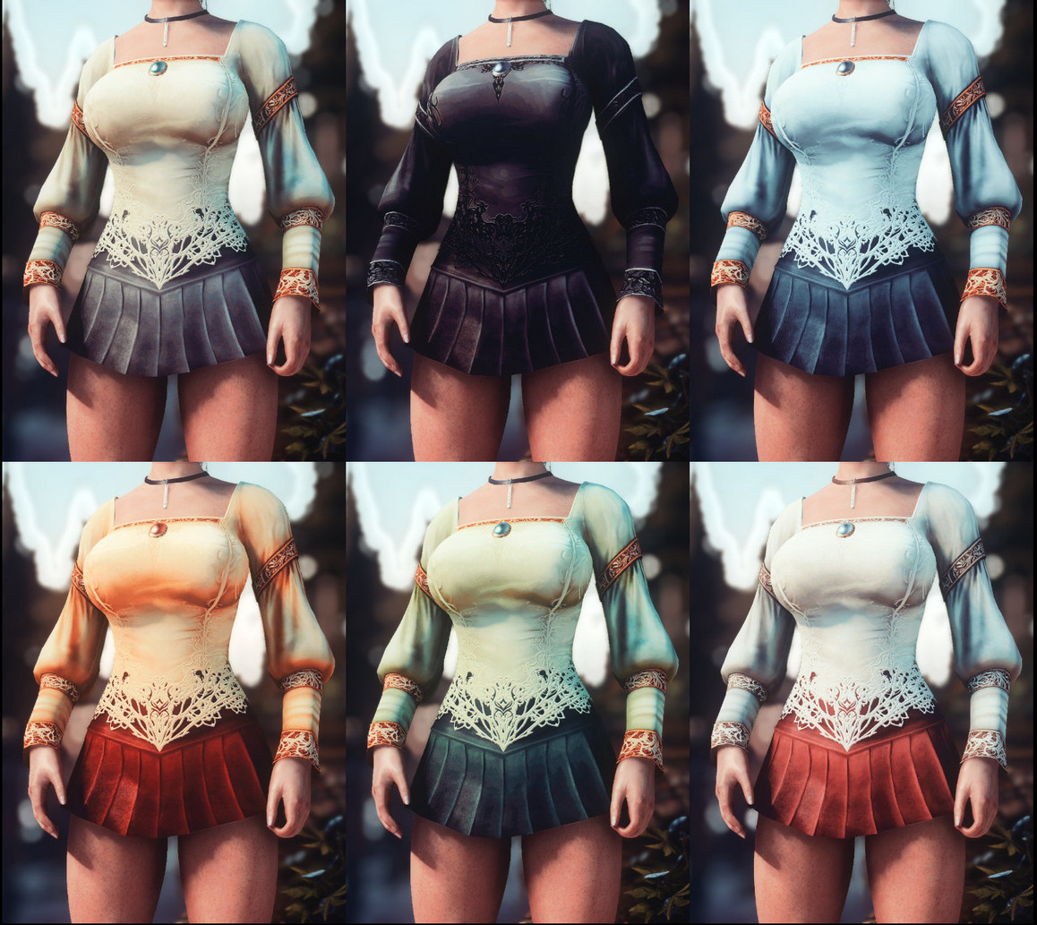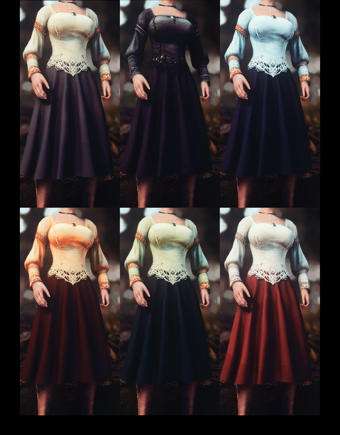 Лёгкая броня Фионы для женских персонажей из игры Haunting Ground (Demento) для Skyrim SE/AE. Комплект состоит из платья (короткое и длинное), сапог, пояса и ожерелья. Всё, кроме ожерелья выполнено в нескольких цветах. Изготавливается броня на дубильном станке и в кузнице (только ожерелье). Рецепты появятся только если у вас в инвентаре есть книга "Пошив одежды для принцессы". Найти книгу можно в Вайтране, в бочке под водой в одном из бассейнов на пути к Драконьему пределу или купить у торговцев.