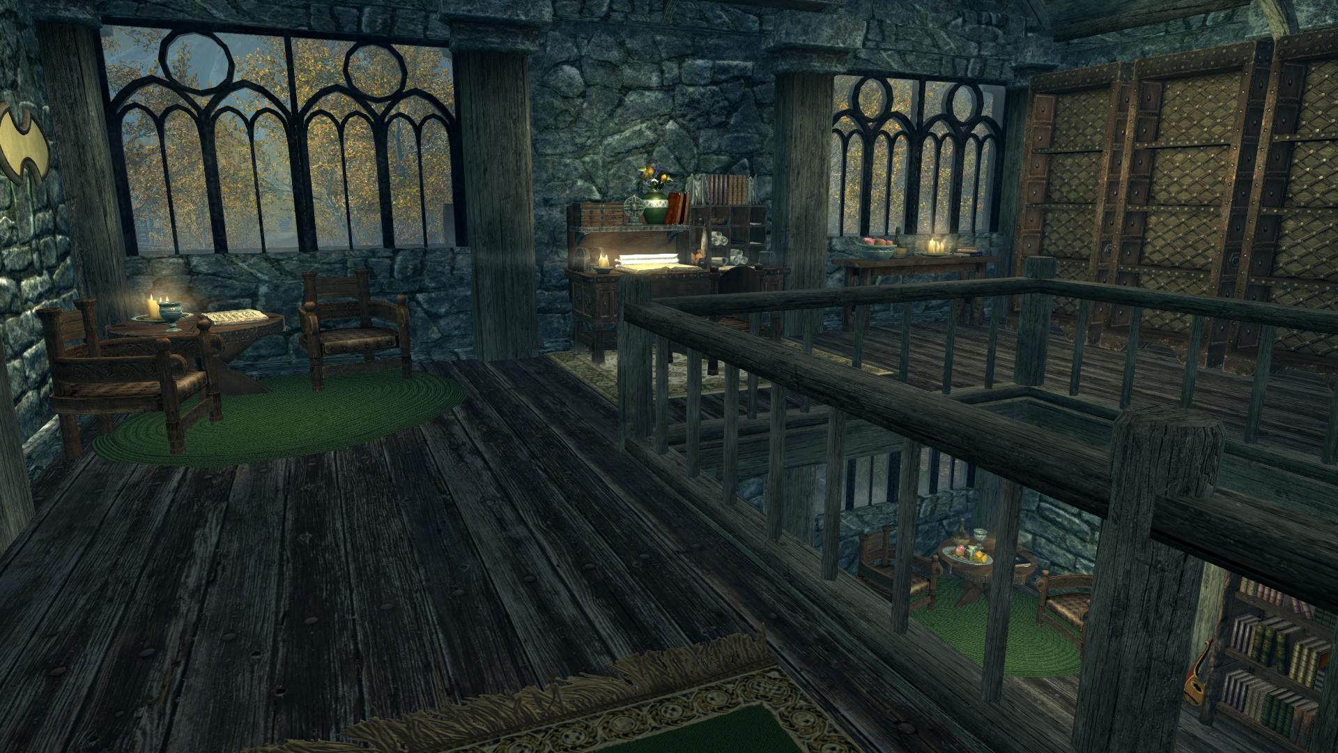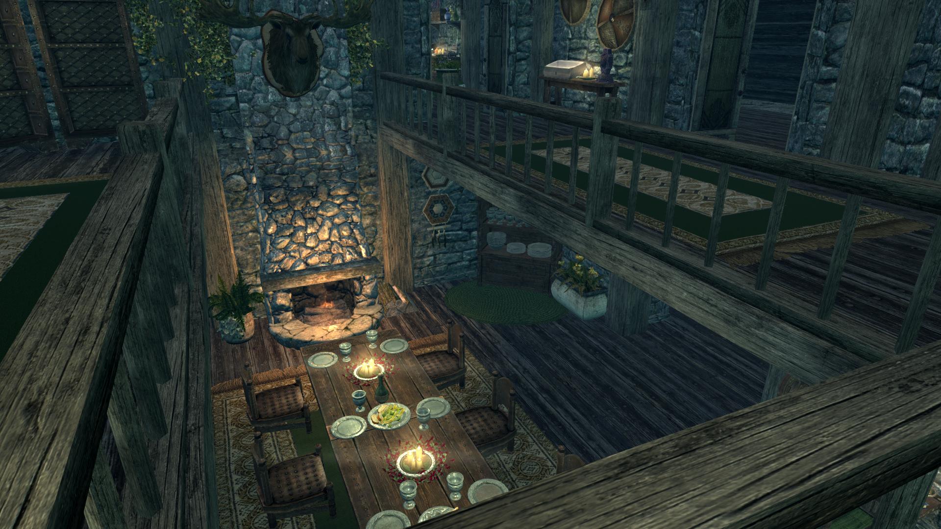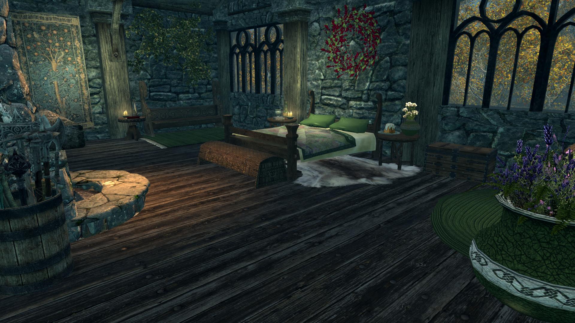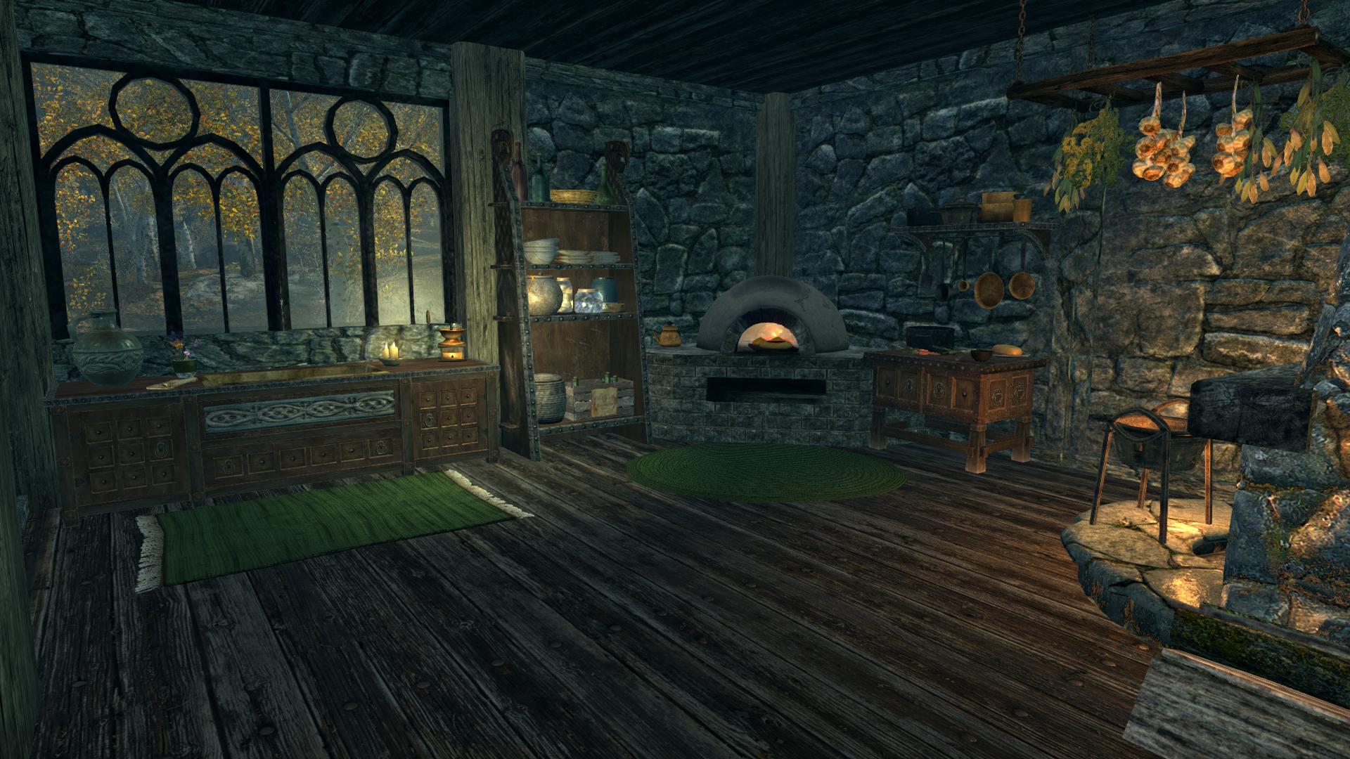 - Три входные двери с разных сторон дома, которые автоматически запираются у вас за спиной (так что не бойтесь, что к вам в дом забредут дикие животные или вампиры). Однако возле дома враги появляются довольно часто, как и в поместьях Hearthfire, так что, если не хотите отвлекаться от домашних дел, лучше завести охрану с помощью мода Мой дом - твой дом (обожаю этот мод, даже и не знаю, как я жила без него).