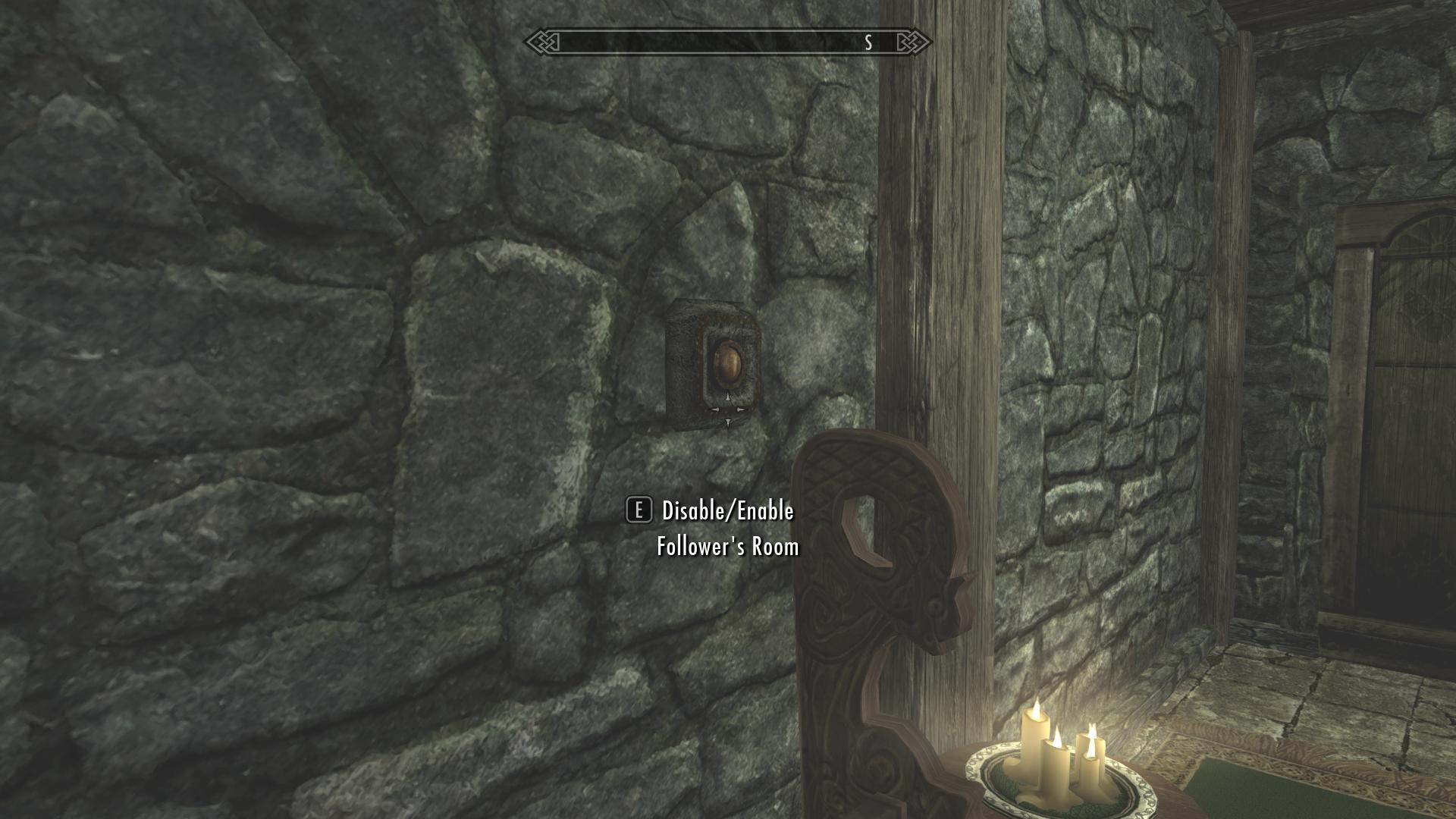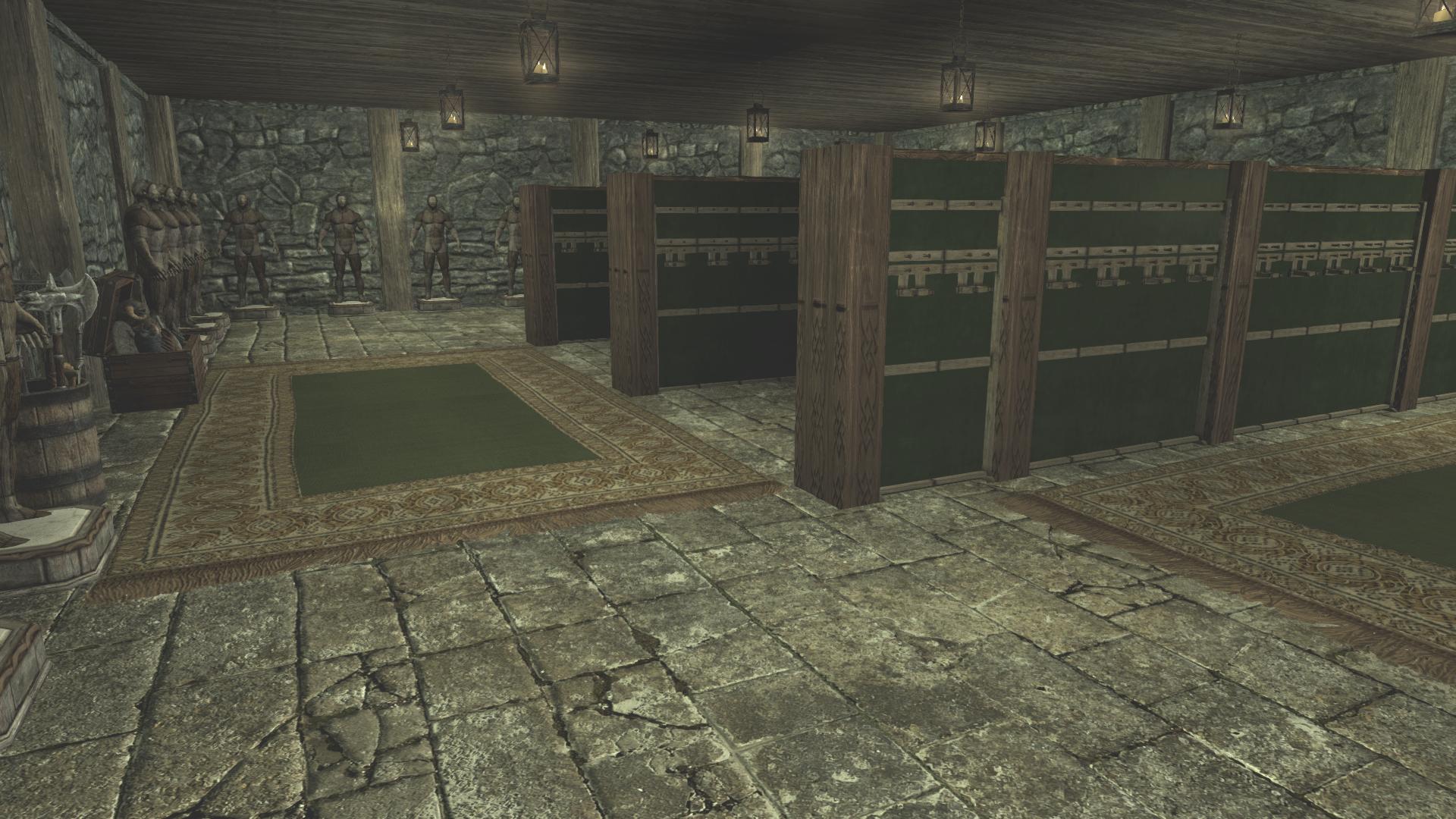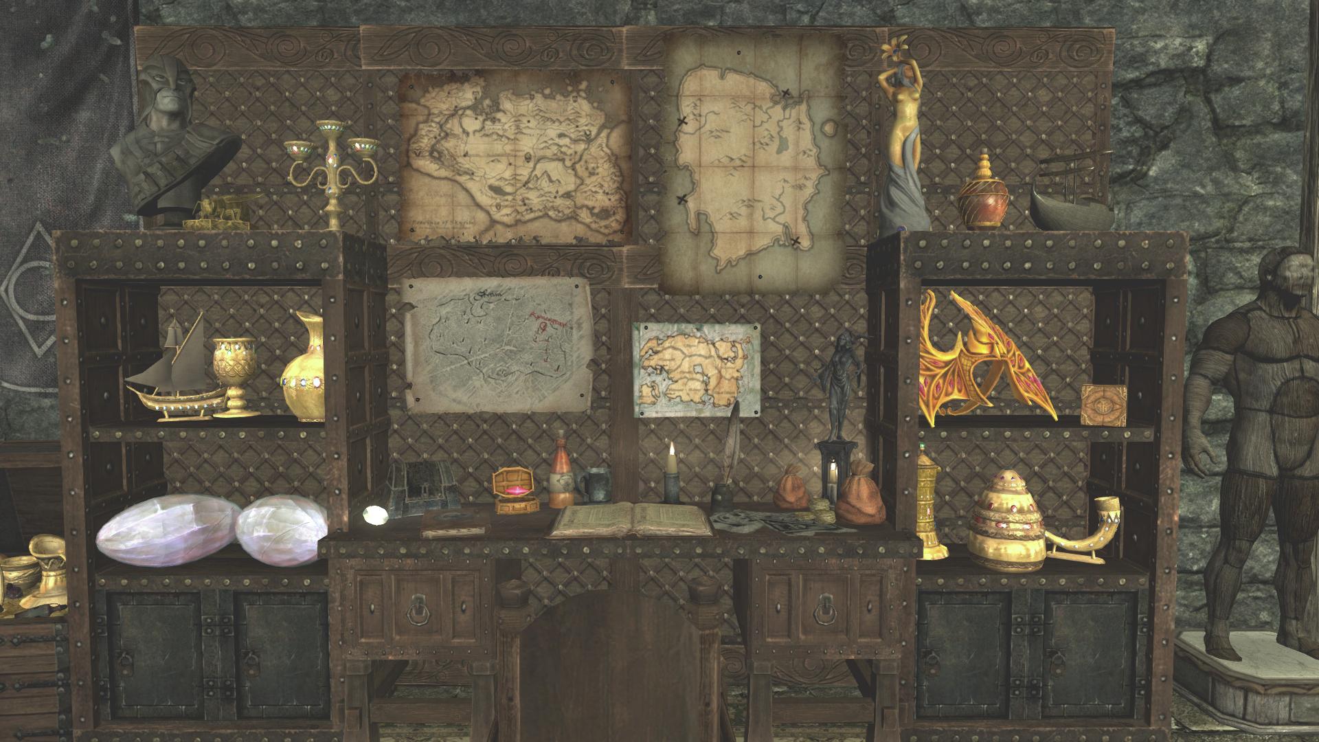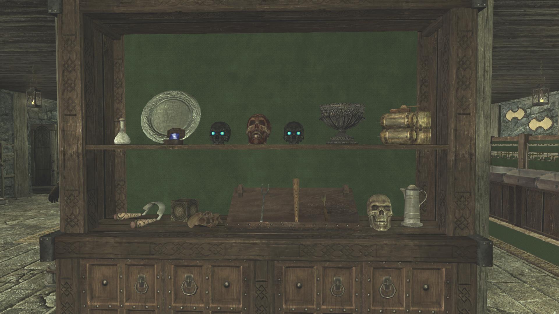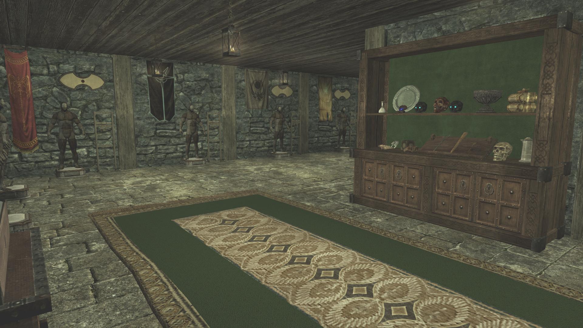 - И наконец - подвал! Фирменный подвал от Синдала. В подвале можно с помощью кнопок добавить или убрать три помещения: музей, оружейную и комнату для компаньонов. Загрузка двери в подвал есть, но на полке рядом есть сундук для сброса трофеев, связанный с тумбочкой в подвале, так что постоянно ходить туда-сюда не придётся. На тумбочке лежит книга со списком предметов, которые можно разместить в музее (переводить её было нелегко).