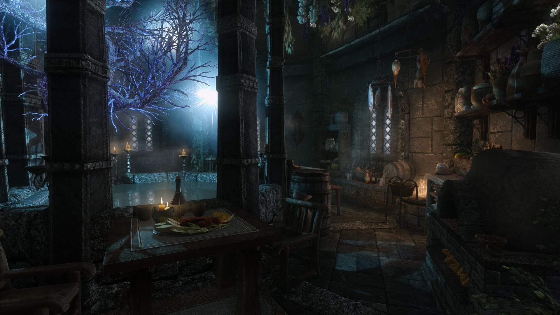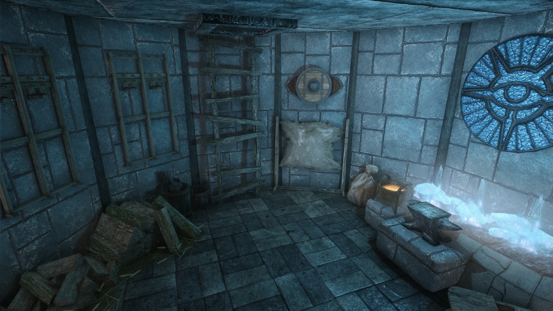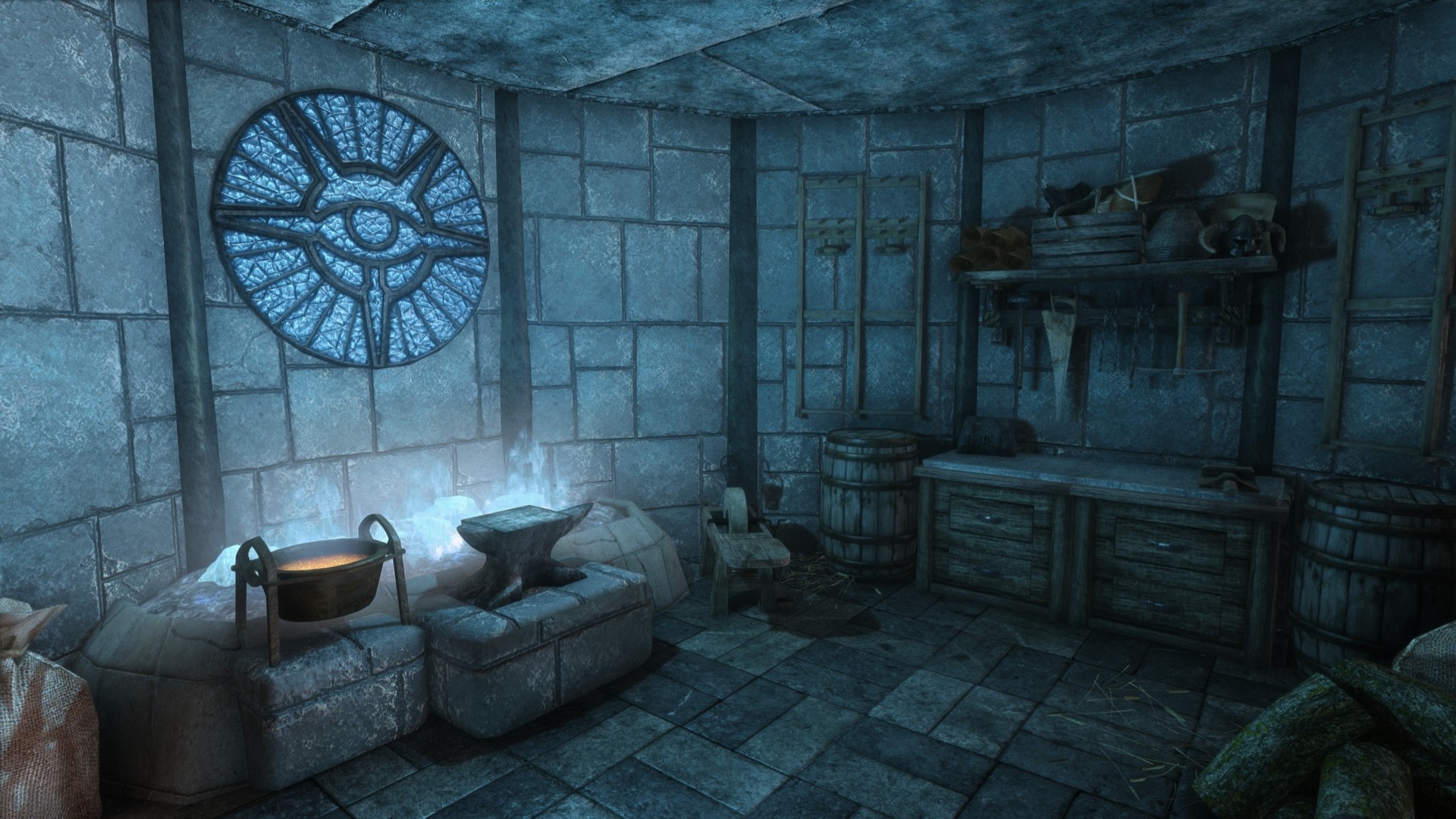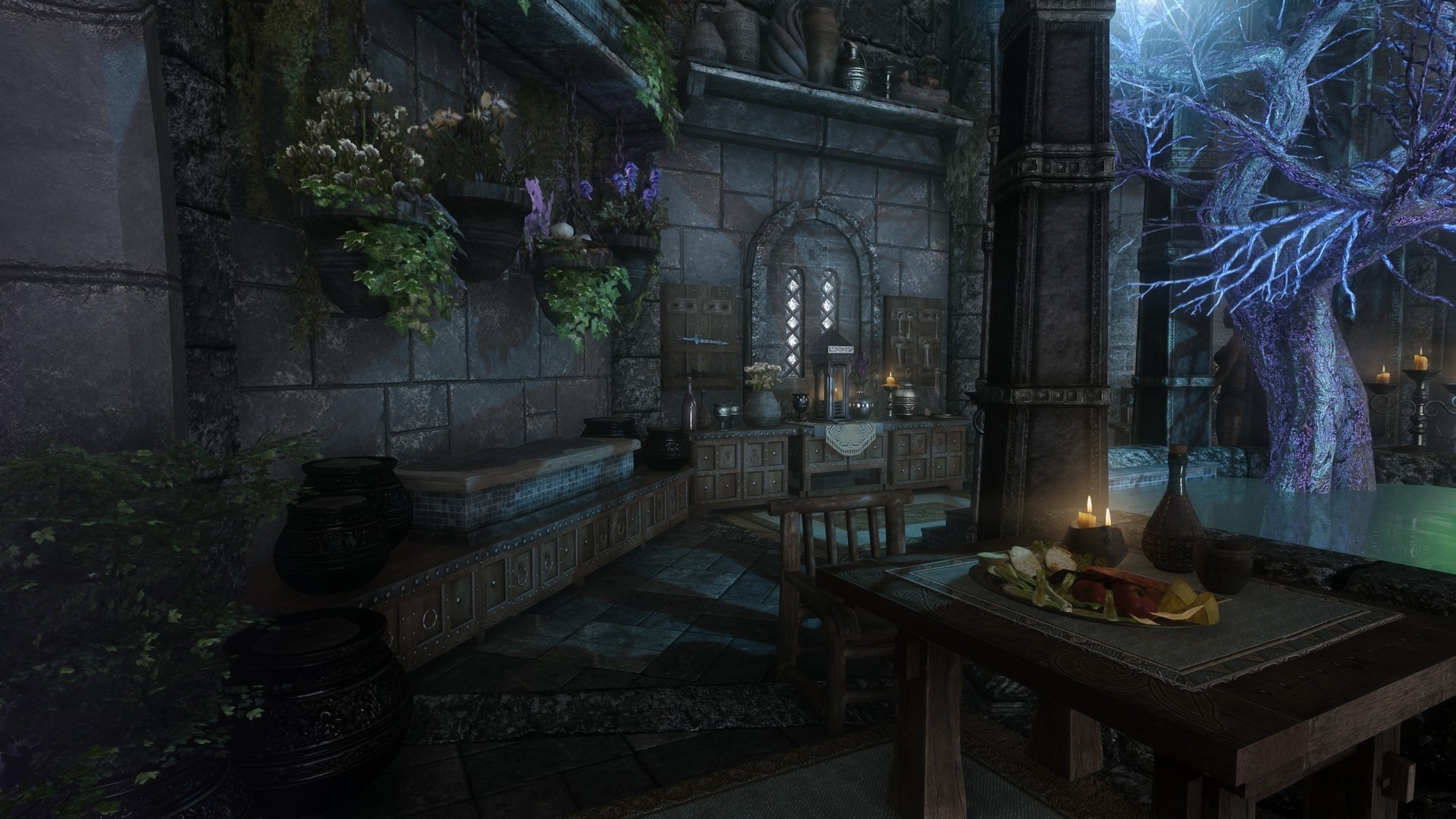 На первом этаже расположена библотека/кабинет, стол для зачарований и алхимическая лаборатория. На втором этаже спальня, кухня, сад, кладовая. В подвале находятся кузница и плавильный котёл.