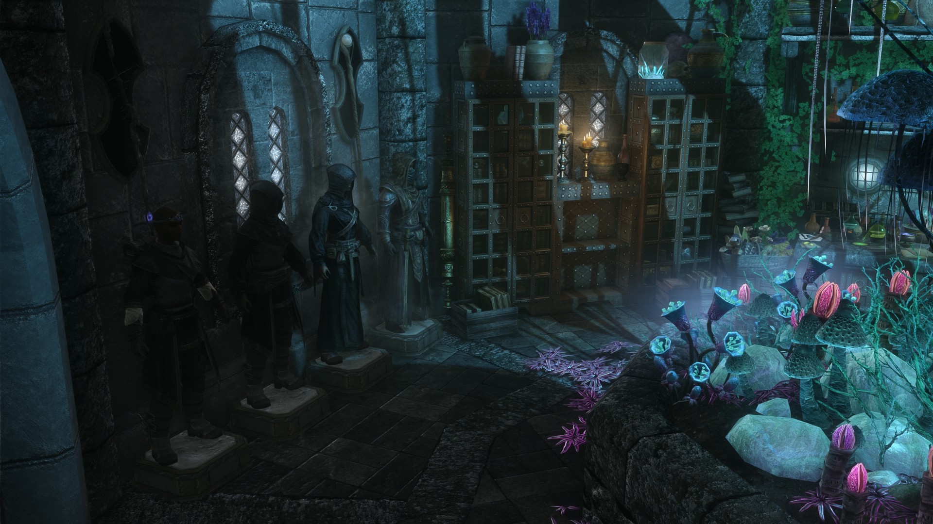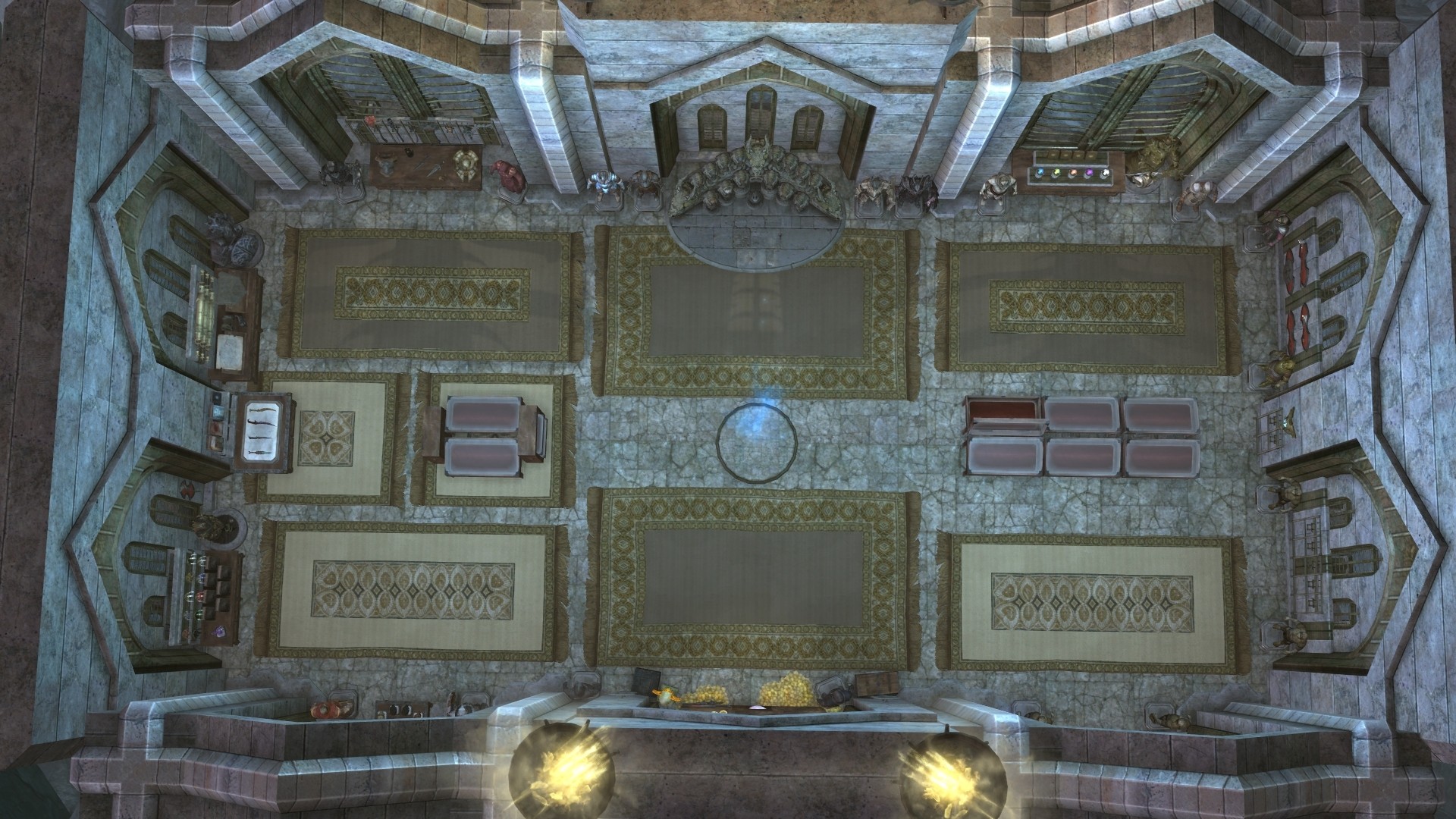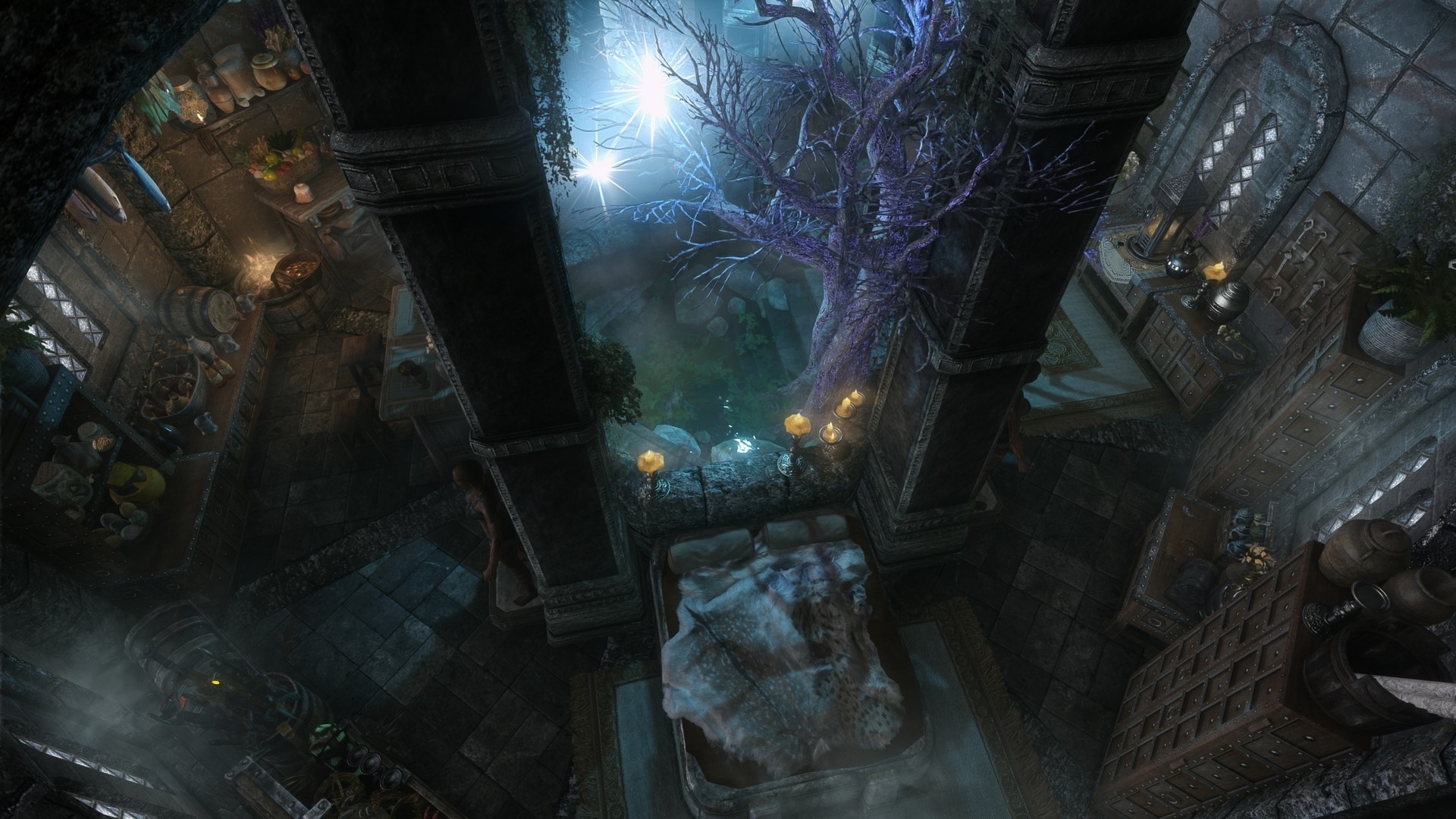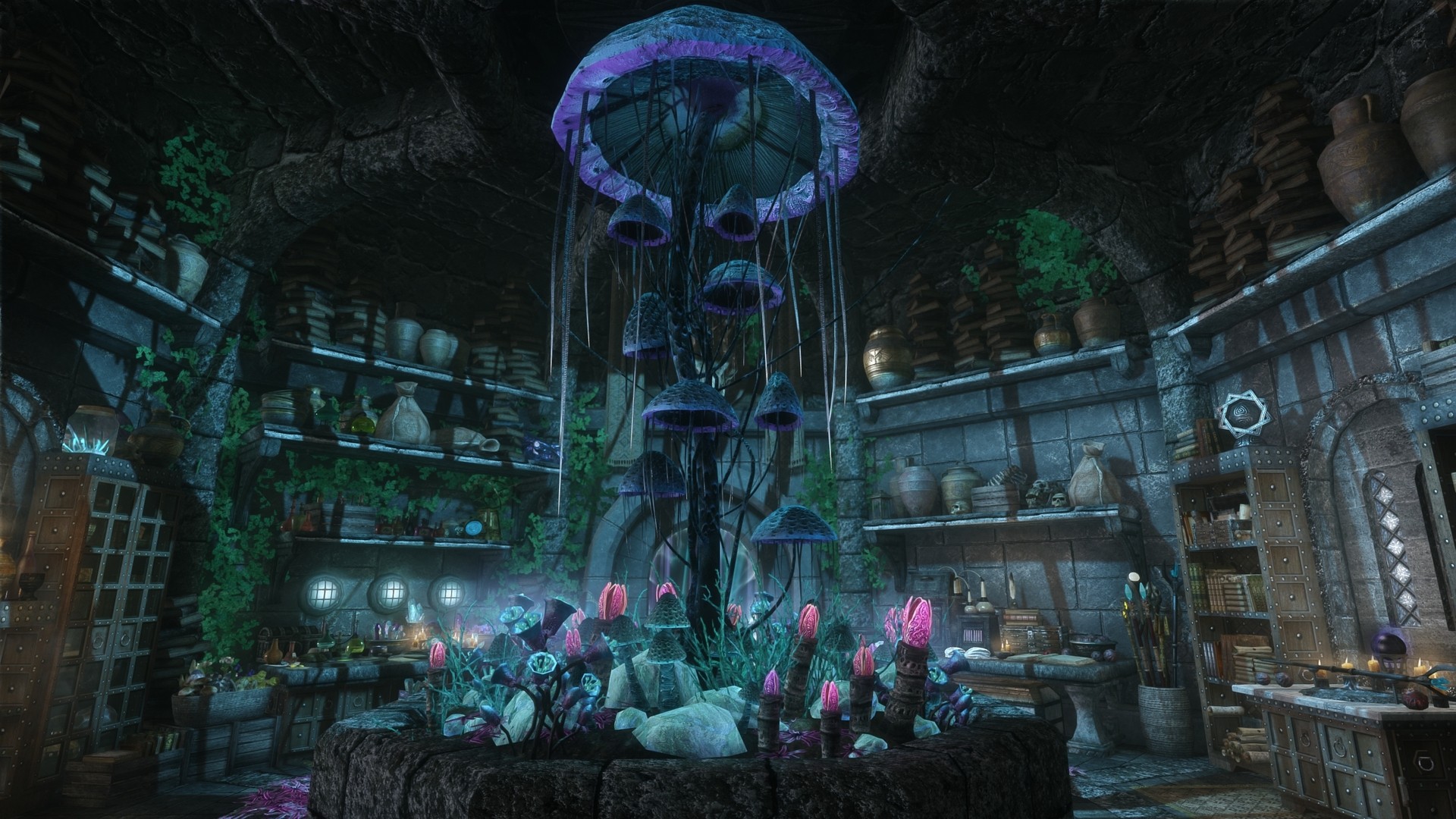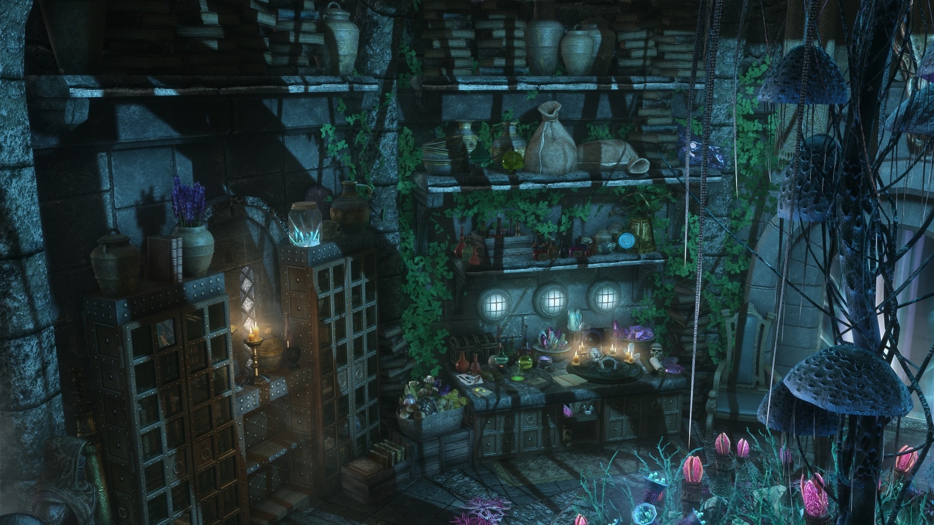 На первом этаже расположена библотека/кабинет, стол для зачарований и алхимическая лаборатория. На втором этаже спальня, кухня, сад, кладовая. В подвале находятся кузница и плавильный котёл.