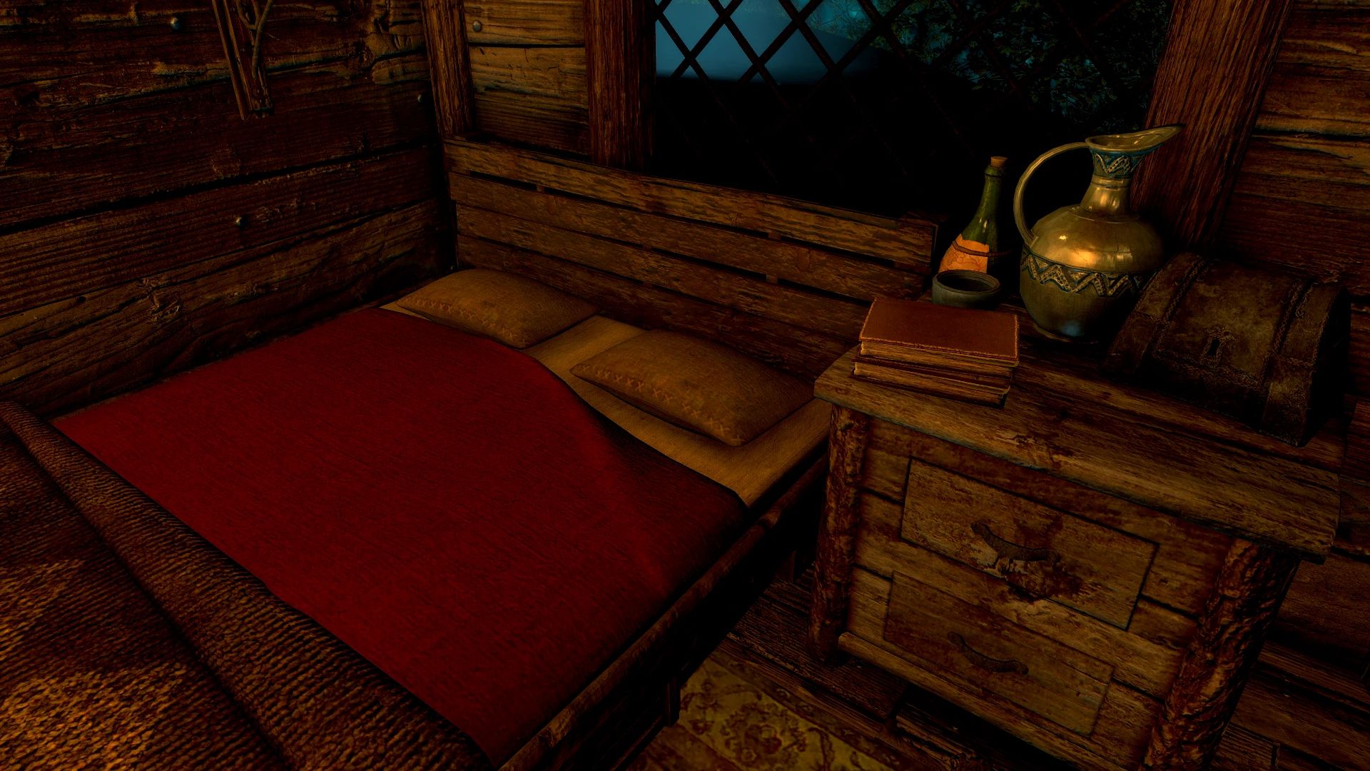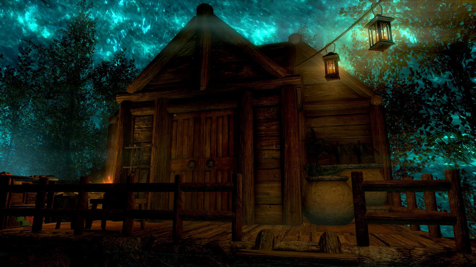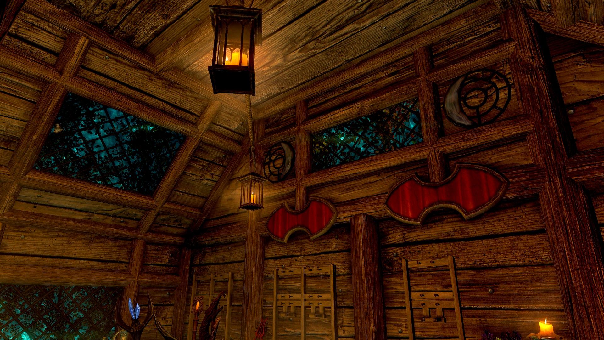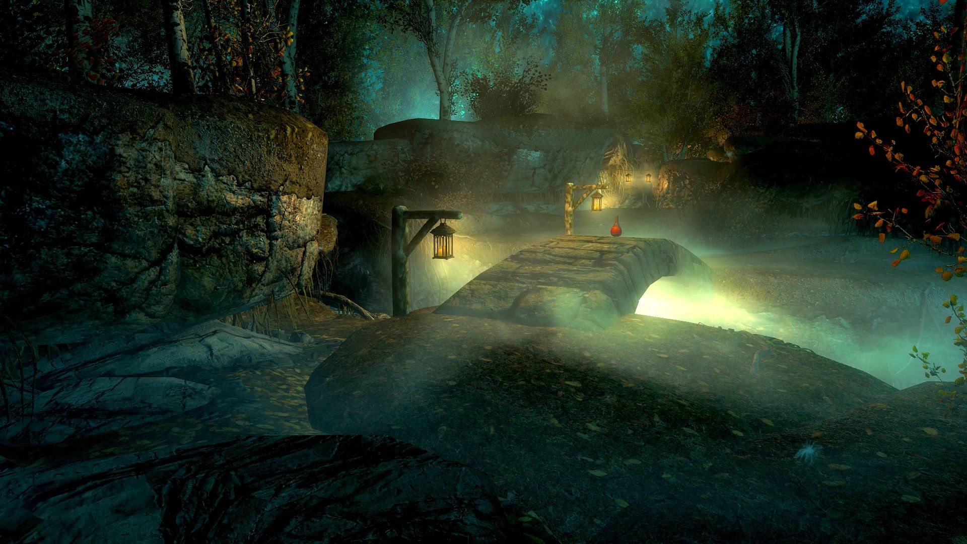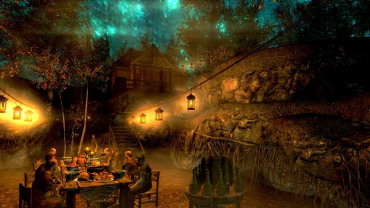 Много лет назад, задолго до того, как я научился пользоваться Creation Kit, моя супруга как-то мимоходом заметила, что, кажется, даже не помнит, что Туманная Роща была бы отличным местом для игрового дома. Я хранил это замечание в памяти, пока не смог воплотить его в жизнь. И я действительно воплотил! Дом с незамысловатым названием «Туманная Роща» расположен, как вы, возможно, догадались, в Туманной Роще Сангвина, месте, где вы получаете Розу Сангвина в «Незабываемой ночи». По пути на вечеринку вы найдёте бутылку лучшего вина Сангвина. Отпив из неё, вы перенесётесь в дом, если находитесь снаружи, и обратно в мир, если находитесь внутри, столько раз, сколько захотите, подобно Двемерскому Кубу Хранения (из которого взят сценарий).