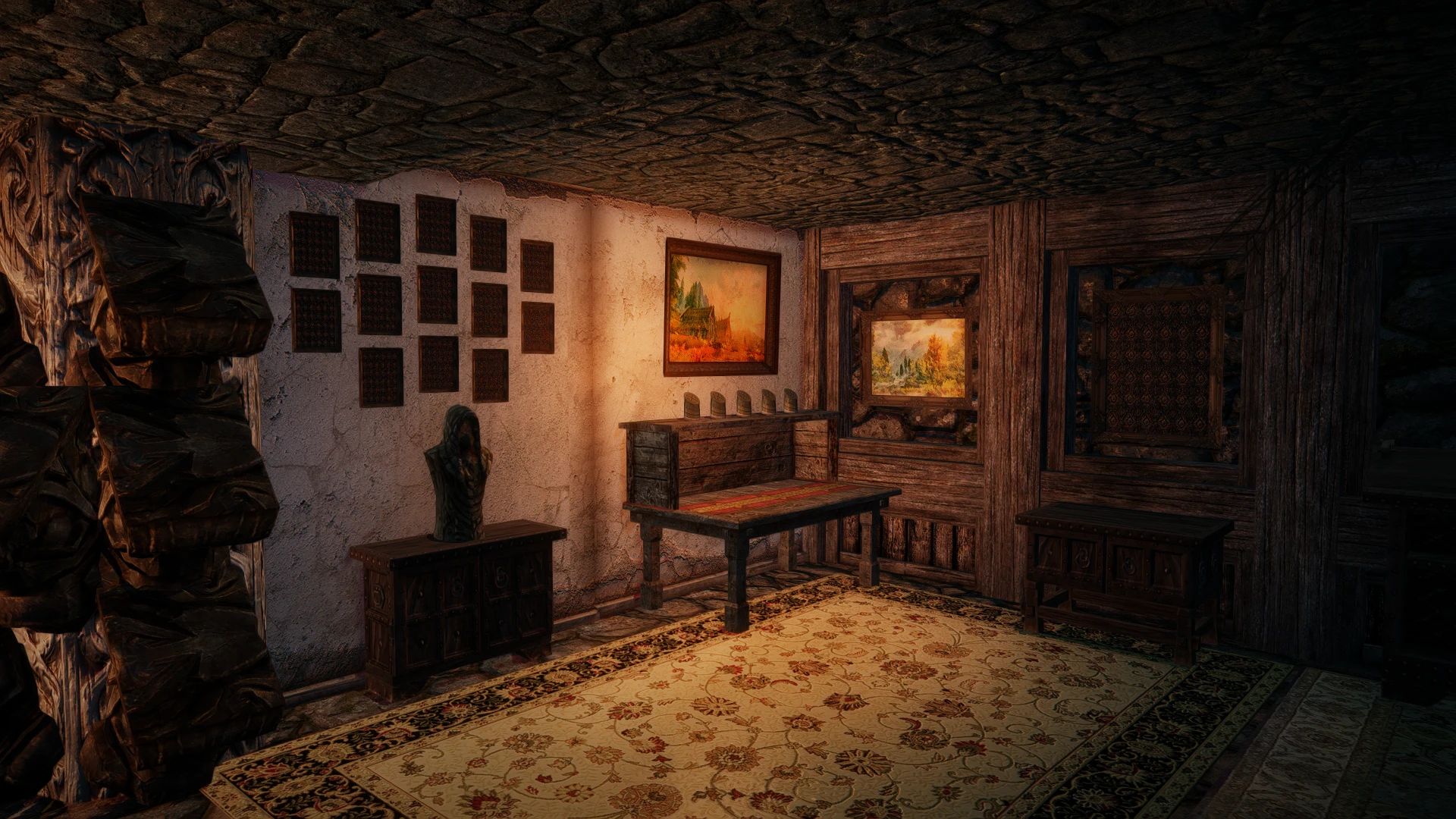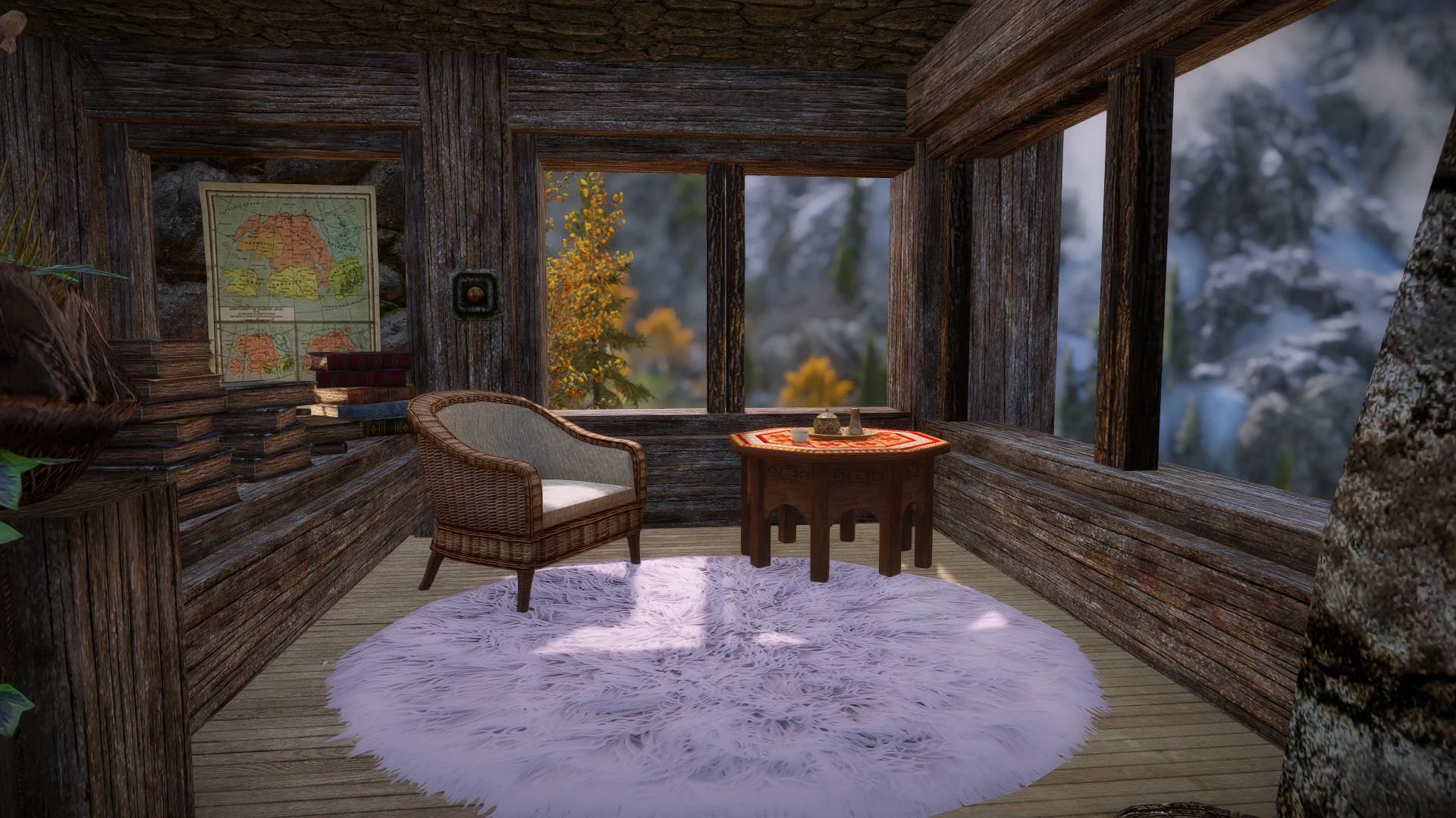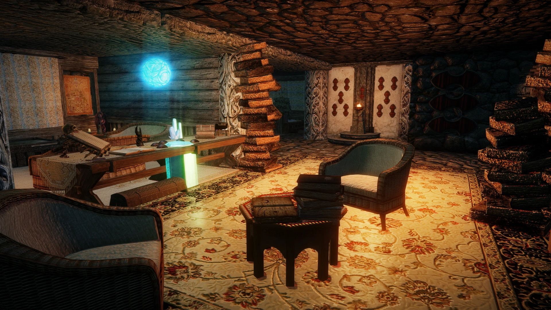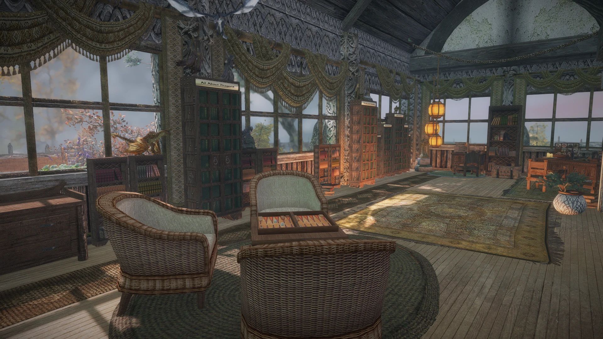 «Убежище учёного» — просторный дом без обременения для учёного, супруги/супруга и последователя. Здесь есть большая библиотека, безопасная комната на 5 человек, сады, уголок для алхимиков, полноценный зал для крафта (без пауков), выставочные зоны и переоборудованная спальня/ванная с новым освещением и окнами. Кроме того, теперь здесь больше сада.