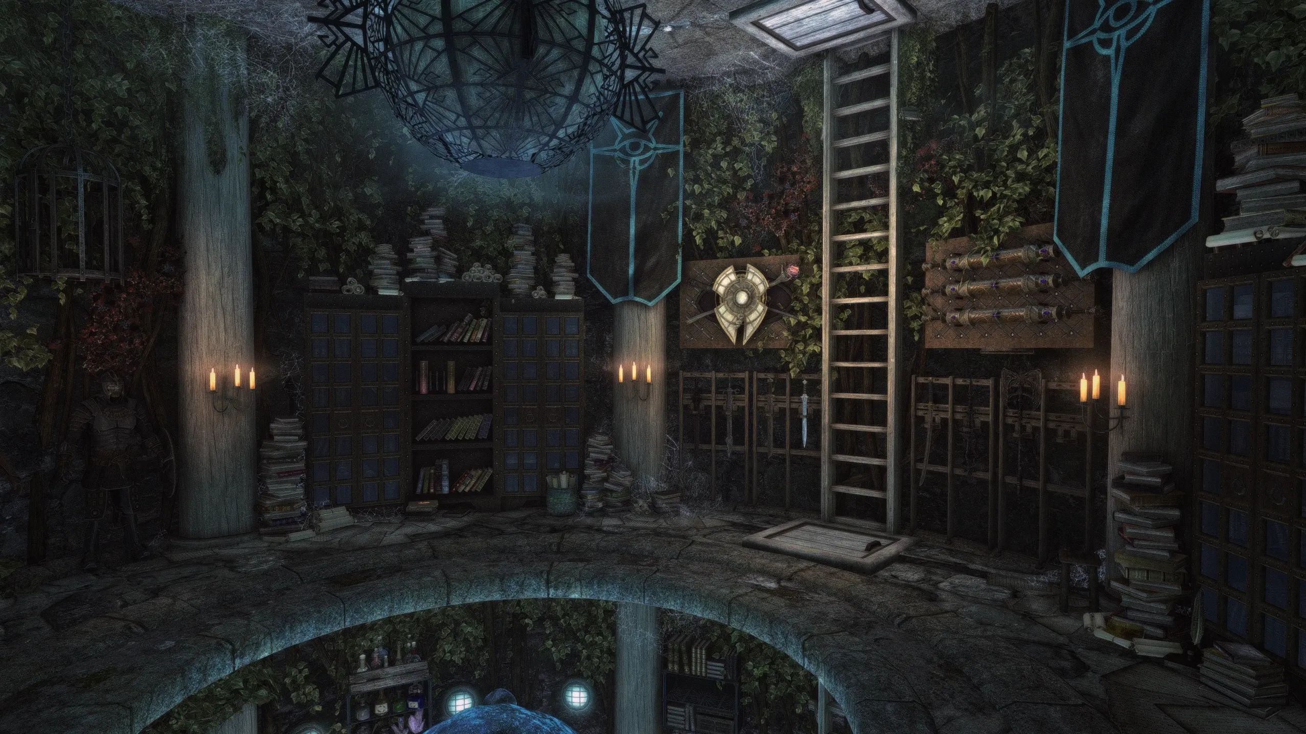 - Место для демонстрации, манекены и витрины для множества уникальных предметов в игре: масок, когтей, даэдрических предметов, Черных книг, Древних свитков.