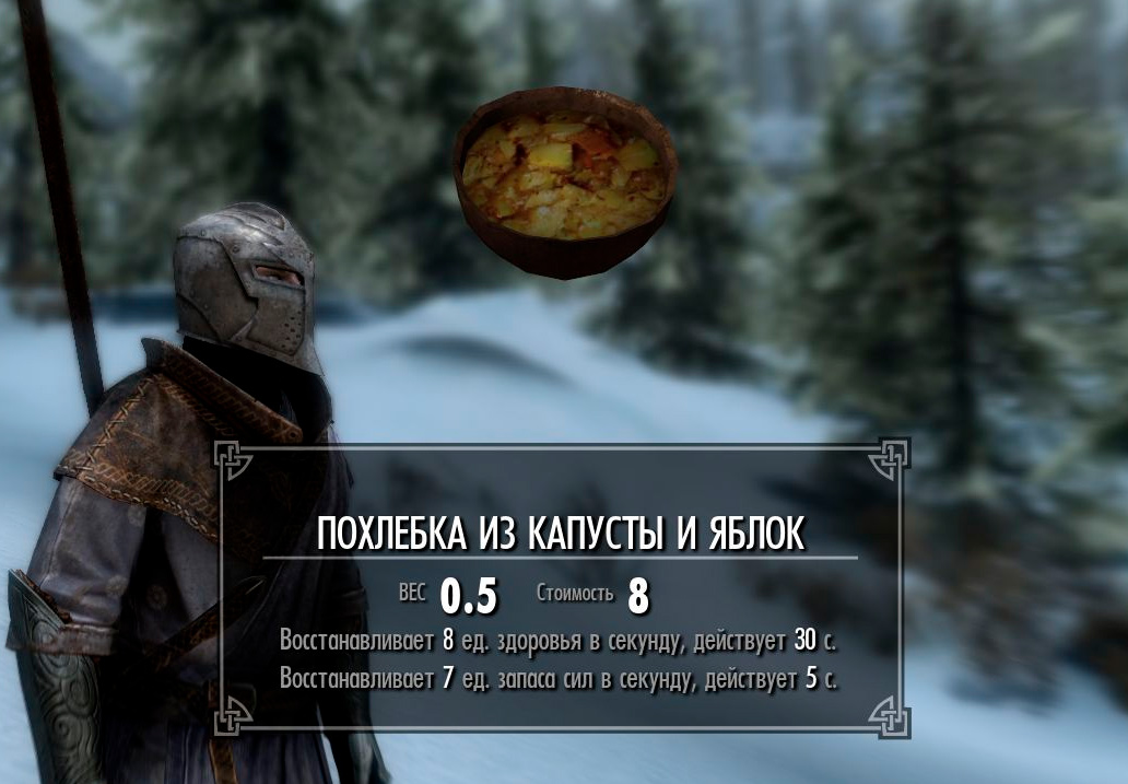 - Еда действует лучше. Чем сложнее рецепт и чем больше он требует ингридиентов, тем сильнее будет эффект восстановления здоровья, магии или запаса сил. Простая еда (овощи, сырое мясо) обладает самым слабым эффектом, более сложная (супы, жареное мясо) действует лучше, а комплексные, сложные блюда (дополнение "очаг") наделены самыми сильными свойствами.