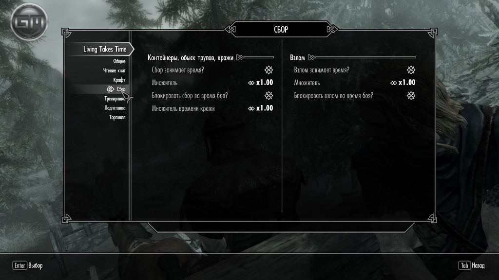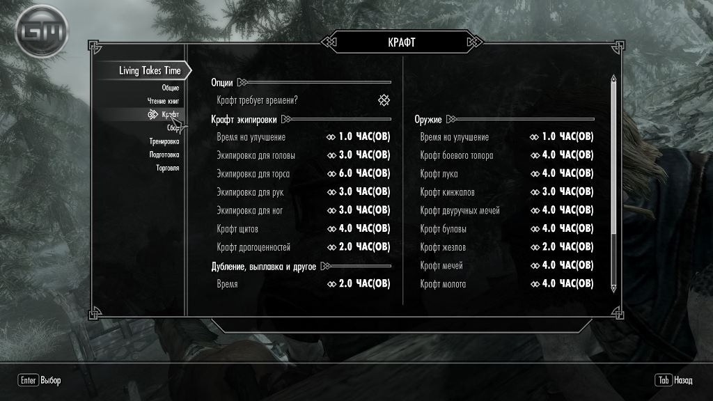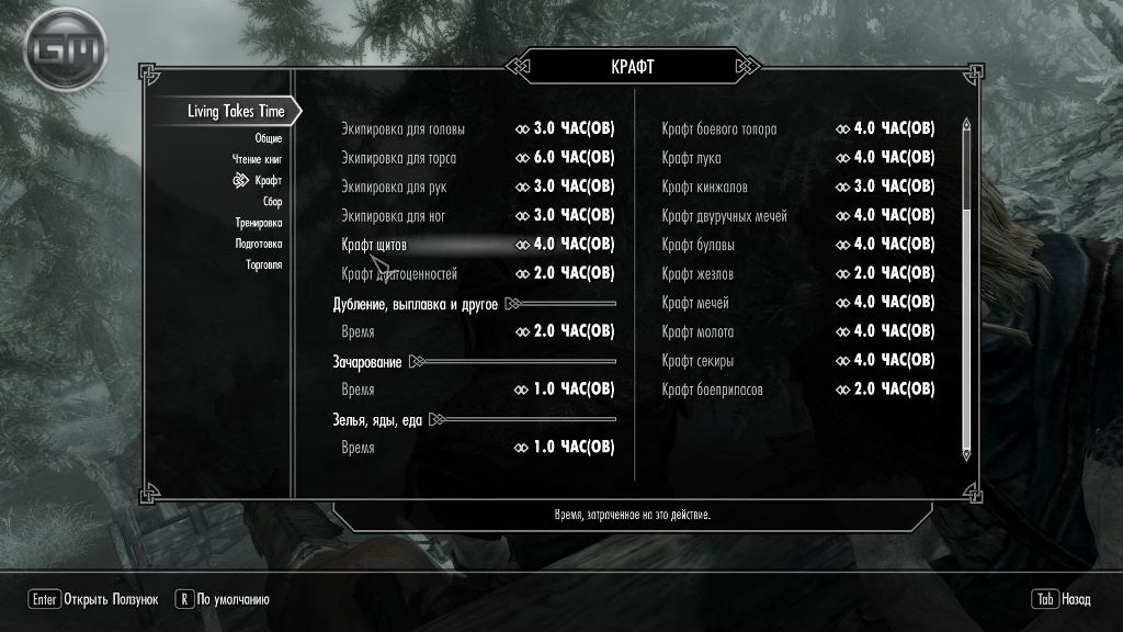 Этот мод для всех, кто любит реализм в Скайриме. Мод изменяет систему времени в игре. Теперь при создании предметов, сборе растений, создании зелий, наложении зачарования и т.п. событиях игрок будет затрачивать игровое время. Все параметры затрат игрового времени можно настроить в меню мода. Дополнительно мод предоставляет опции блокирования разных окон во время боя. Например, находясь в состоянии боя, игрок не сможет (настраивается) открыть меню инвентаря, магии и т.п., что добавляет ещё порцию реализма. В итоге, изготовление к примеру меча, потребует к примеру 1 час времени и игрок не будет как было в ванильной игре стряпать за 1 минуту 100 кинжалов. Также в бою в ванильном Скайриме можно было открыть меню магии или инвентаря, отдохнуть, нажраться зелий, сменить экипировку и т.д. Теперь же пока вы сражаетесь, будьте добры победить, а уж потом отдохнуть. Такой похожий реализм добавляет к примеру мод Requiem, где нельзя сменить экипировку во время боя.
