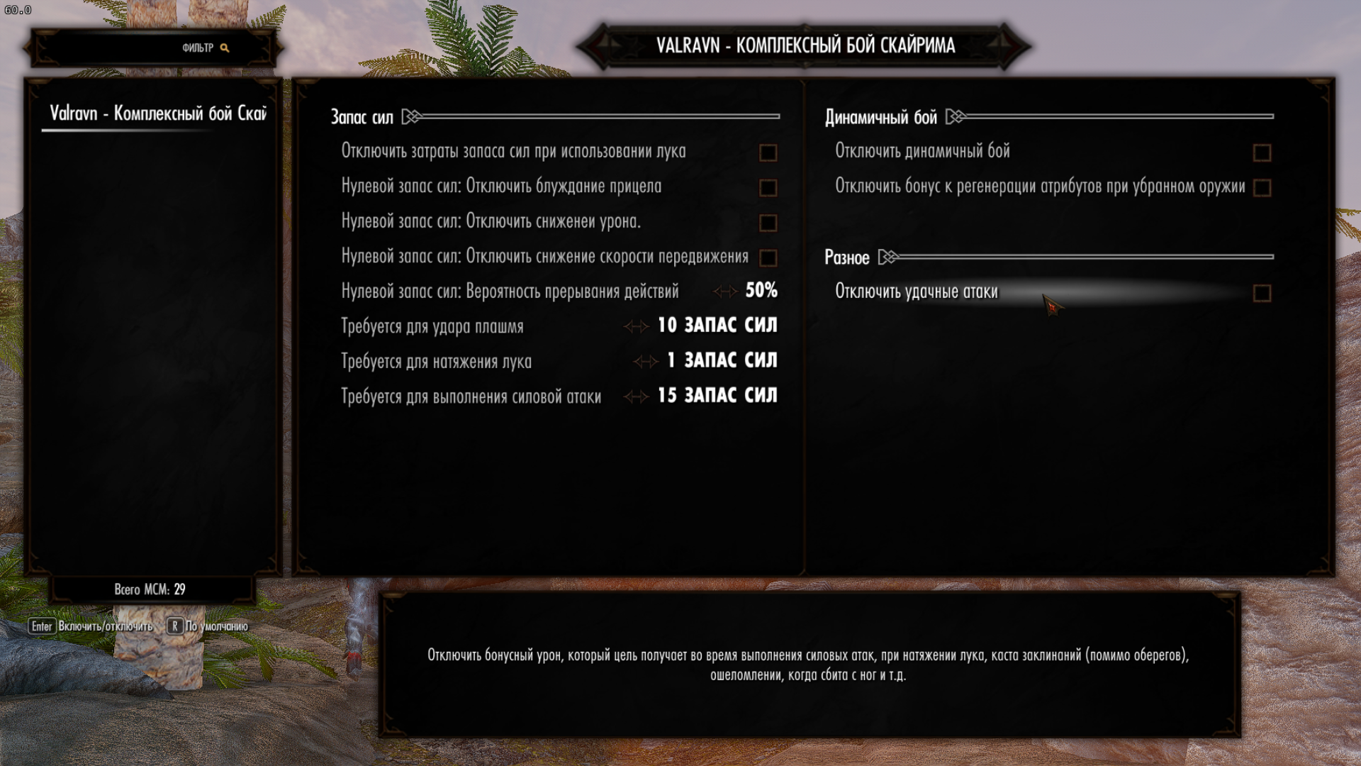 - Параметры конфигурации доступны в Valravn MCM, если установлен SkyUI (SkyUI НЕ требуется для использования Valravn).