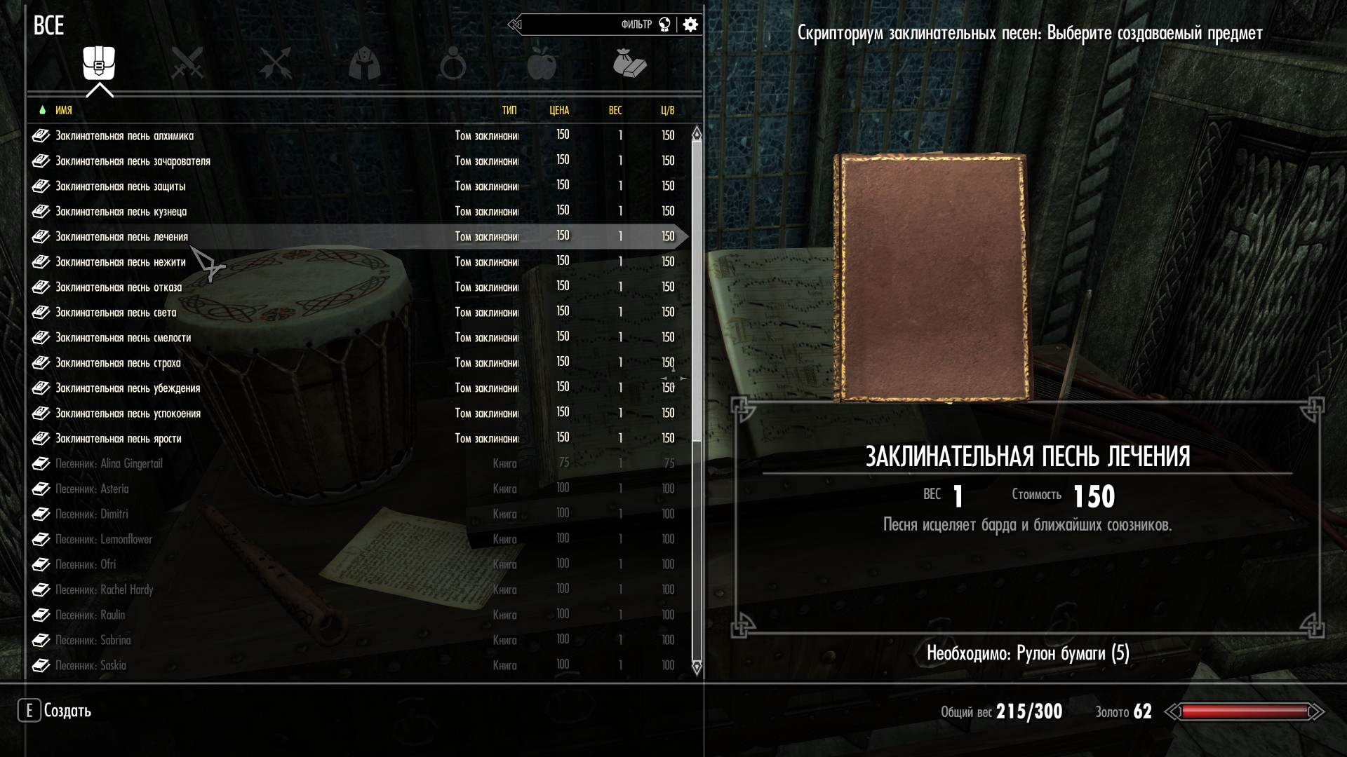 Сразу доступна только часть песен. Новые будут появляться по мере улучшения вашего навыка барда. Поскольку тома заклинательных песен требуют для изготовления бумагу, в меню дубильного станка был добавлен рецепт бумаги. Система магии сделана на основе мода Spellsinger от blueboar с использованием ресурсов и некоторых заклинаний из Support Bards от mechanarwhal.