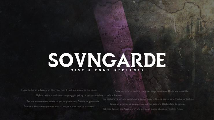 Sovngarde - тематический игровой шрифт. Разработан для усиления погружения в сеттинг игры Skyrim. Создан с поддержкой 8 языков, но в данном архиве предпочтение отдаётся русскому.