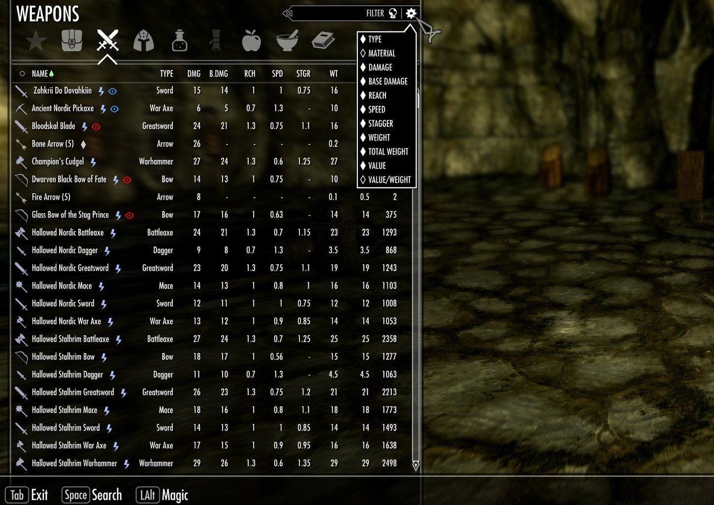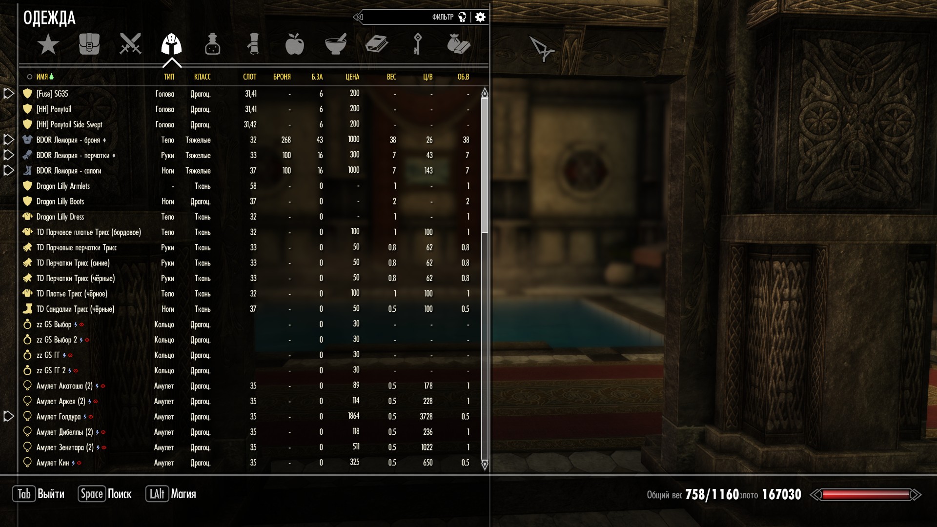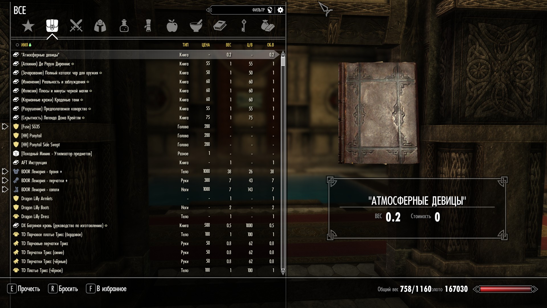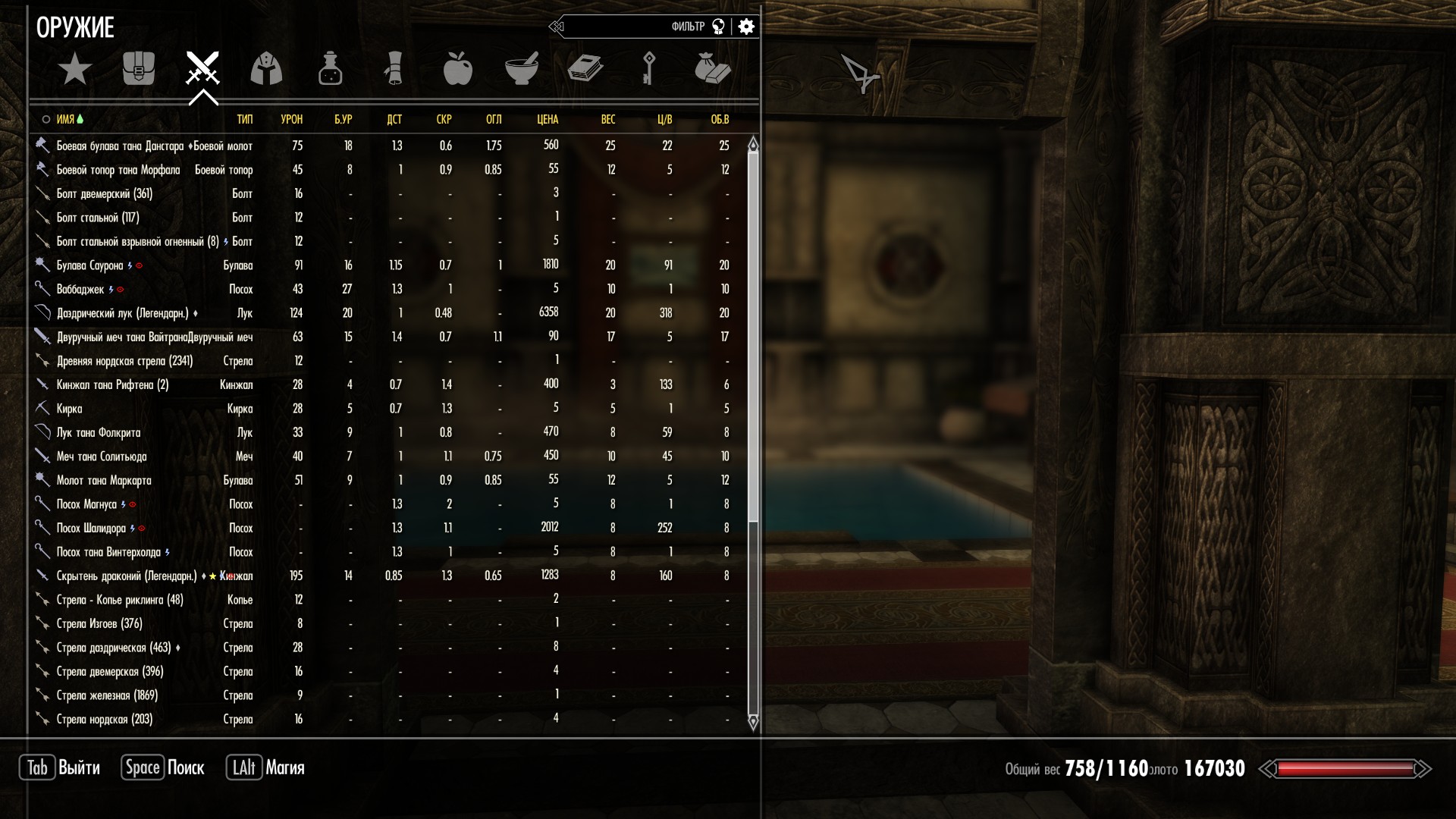 По-умолчанию размер шрифта в меню инвентаря и магии меньше, чем в оригинале, а также многие русские названия не вмещаются в столбцы. К счастью, можно настроить как ширину столбцов, так и шрифты и изменить названия столбцов и параметров предметов через файл конфигурации мода и файл перевода (\Data\Interface\skyui\config.txt и \Data\Interface\translations\skyui_se_russian.txt).
