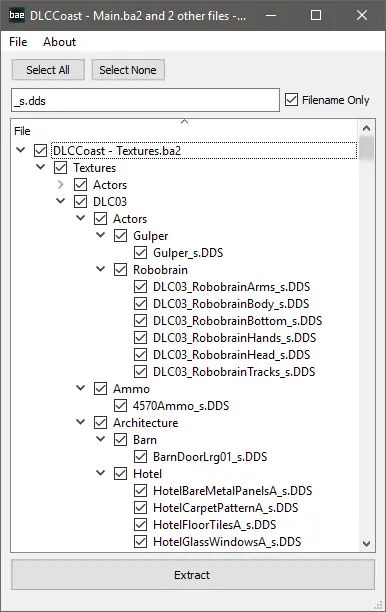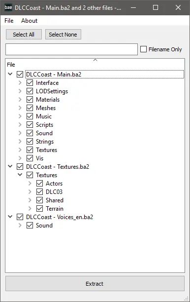 B.A.E. - Bethesda Archive Extractor это утилита для распаковки игровых ресурсов игр The Elder Scrols и Fallout, которые запакованы в .bsa и .ba2 файлы. Интерфейс на английском, но прост и интуитивно понятен даже тем, кто английским не владеет.