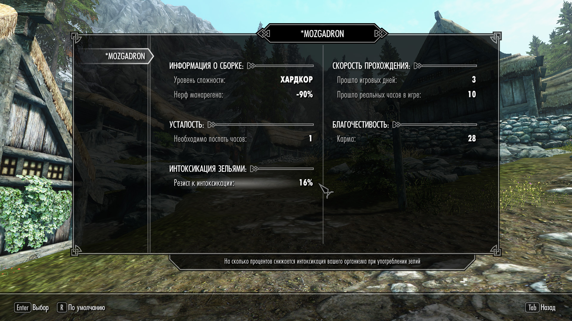 Сборка модов от MODZADROT это самая прокачанная геймплейная сборка для Скайрима из всех, которые только существуют и очень хардкорная. Моды для неё делали около 10-ти русскоязычных модмейкеров за последние два года. Она меняет только геймплей и не трогает никакой визуальной, графической и звуковой составляющей. Все это вы можете добавить уже самостоятельно по своему вкусу.