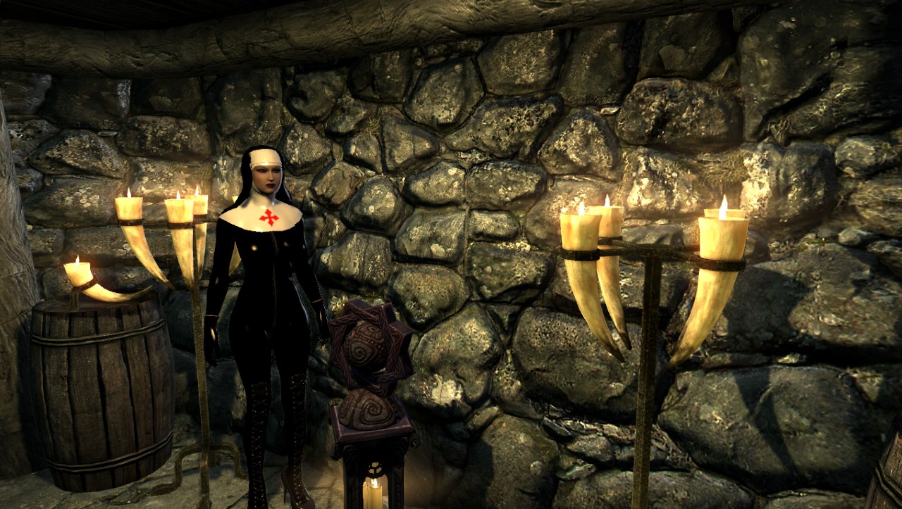 В городе Фолкрит, в зале мертвых, вам нужно найти сундук и вскрыть его отмычкой (уровень замка - новичок). В сундуке вы обнаружите два комплекта латексной одежды для монахинь. Комплекты улучшению не поддаются, но их возможно зачаровать. У них неплохая защита от физических атак, это легкая броня. Один комплект полностью черный, другой полупрозрачный. Тело UNPB без физики.