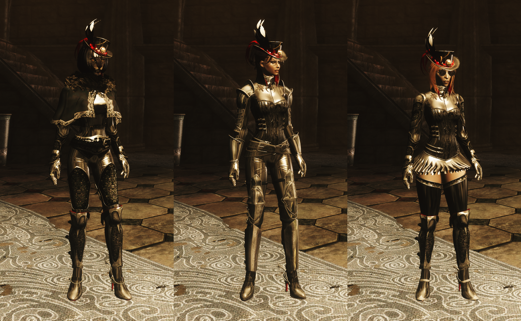 Блестящий, чёрный, облегающий костюм для женских персонажей. Можно выковать в кузнице только при условии, что ваш персонаж женского пола, вампир, владеет кузнечным делом максимального уровня и при этом не аргонианин. Кроме костюма много разнообразных мелочей в виде брошек, воротников и так далее. Почти всё можно улучшить и всё можно зачаровать. На персонажах разных рас вещи могут выглядеть немного по-разному - смотри скриншоты. С расами из модов работоспособность не проверялась.