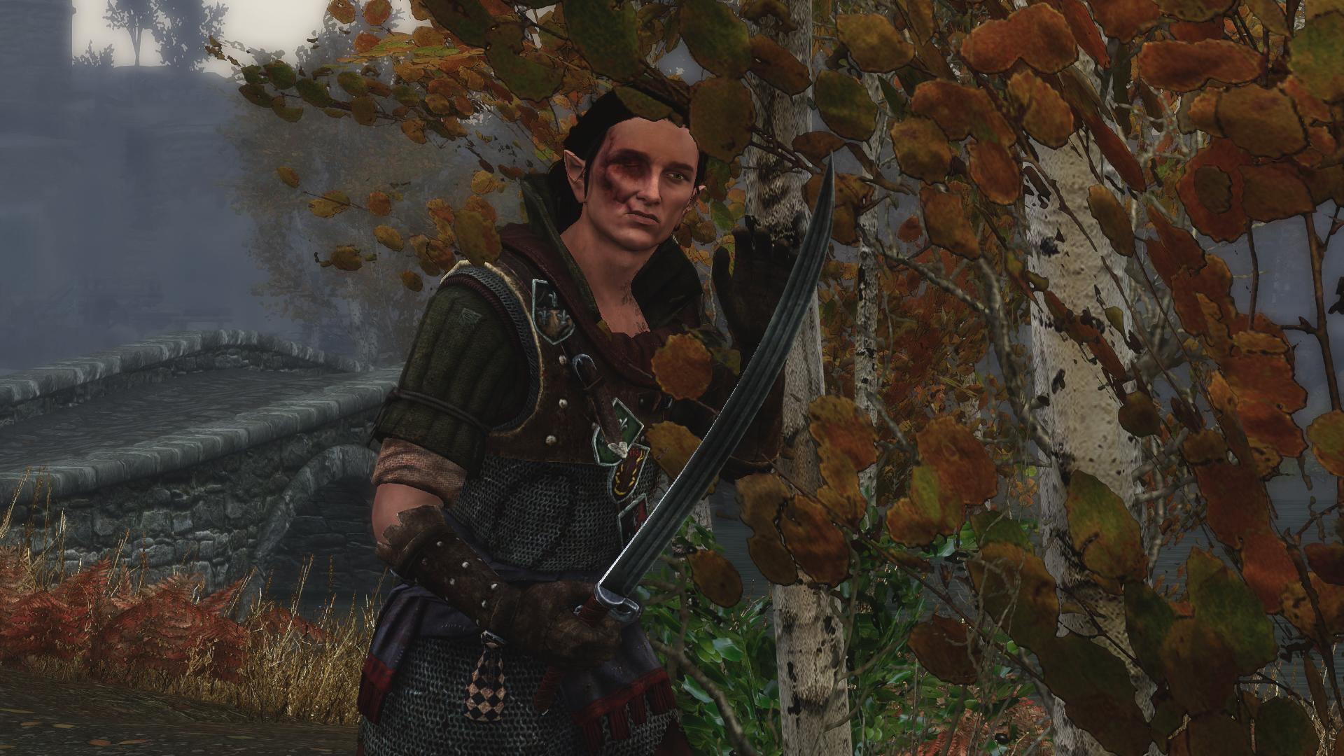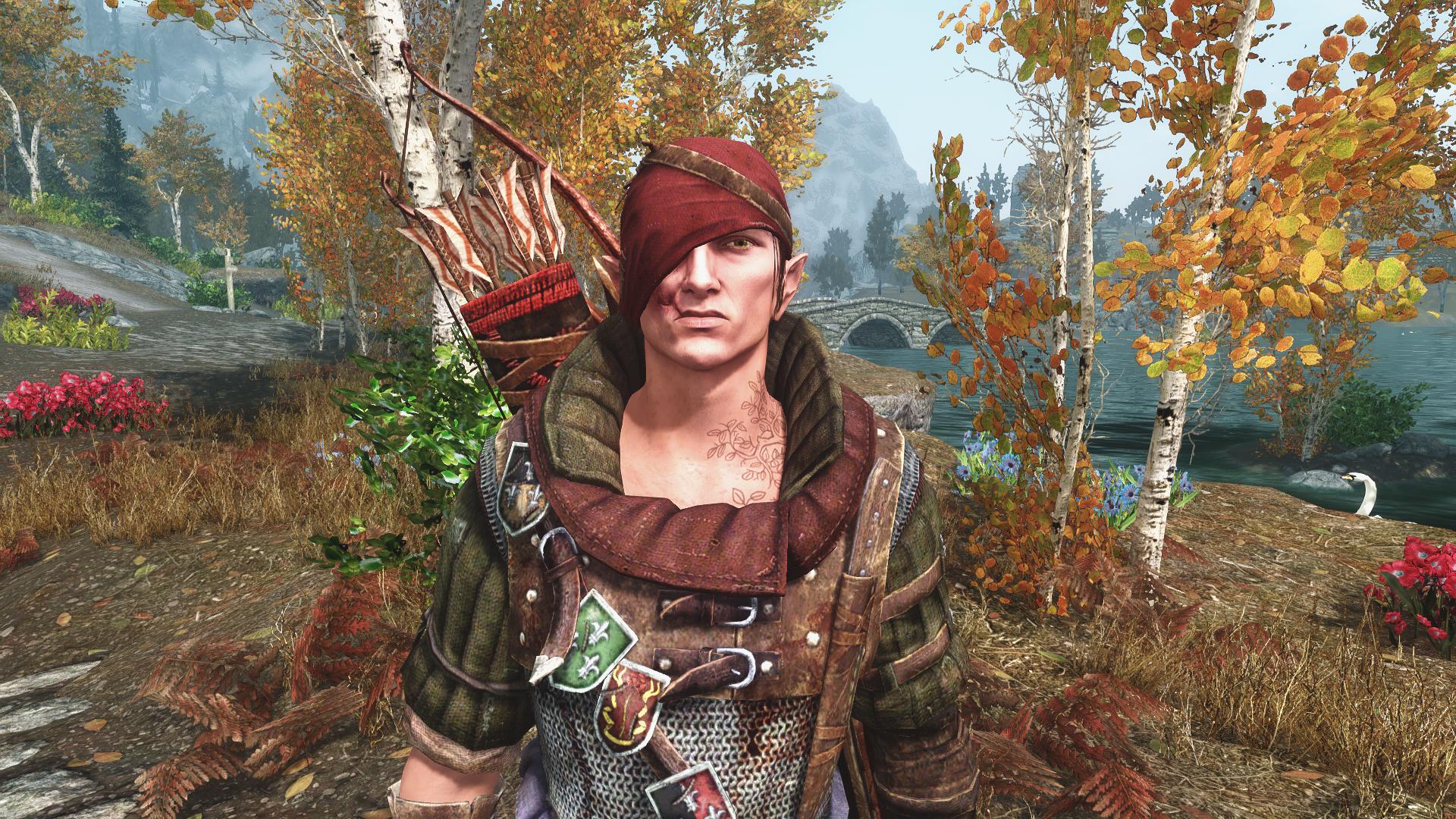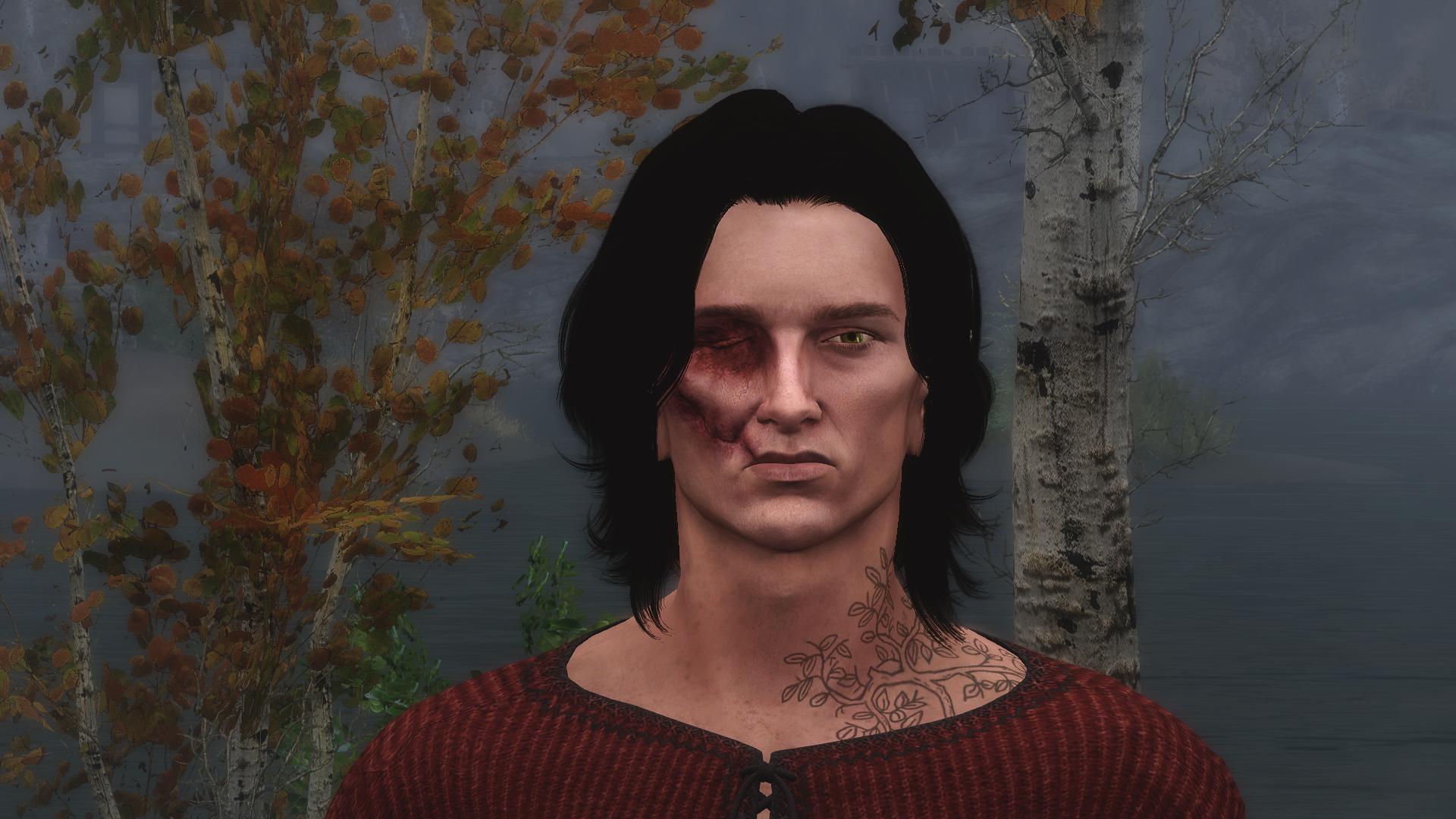 Если активна дефолтная голова со шрамом, компаньон будет поднимать повязку в дружественных локациях (дома Довакина и таверна "Пьяный Охотник")
