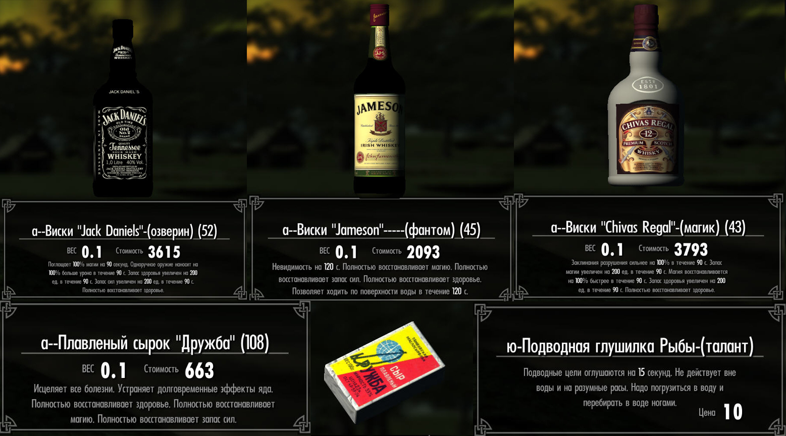 -Виски 3 вида и на закуску плавленный сырок Дружба. Эффекты разные, серьёзные эффекты. Всю эту прелесть мы можем сварить в котелке из разных ингридиентов которых полно в Скайриме. Из всяких там Грибочков и ядовитых растений! Всё моё пойло и закусь покупают все торговцы без исключения. Смотрим скрины. А всё ванильное пойло более не нужно.