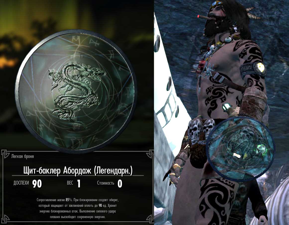 -Щит-баклер Абордаж. Стеклянный и прозрачный. Работает как Разрушитель Заклинаний плюс Щит Ауриэля. Всё в одном и плюс сопротивление магии.