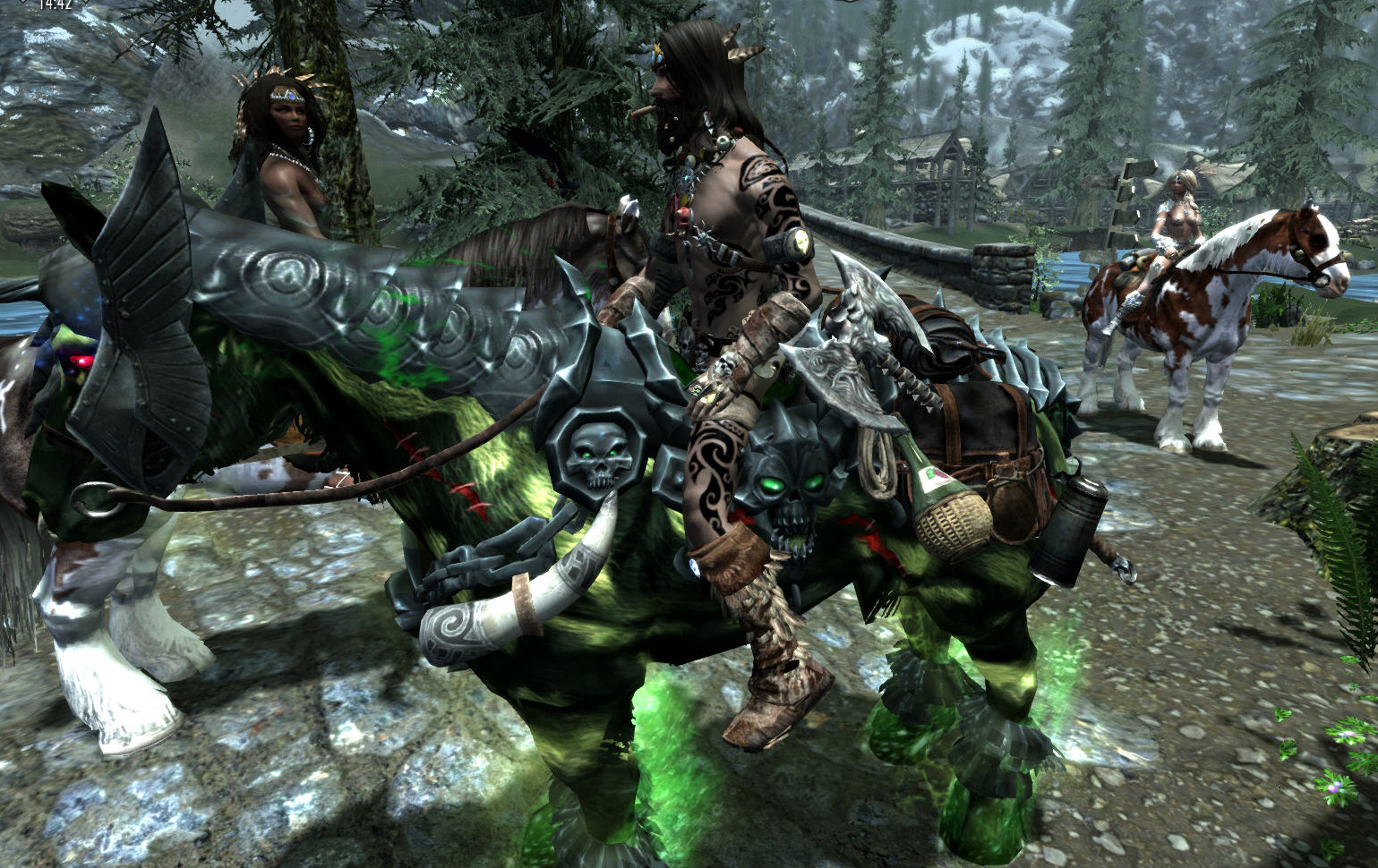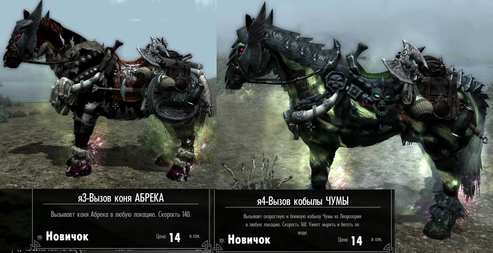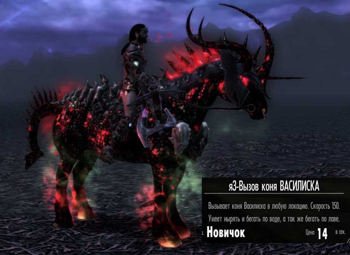 -Вызов лошадей: коней Абрека, Василиска и кобылы Чума. Разные скорости 140-160. Вызываются в любых локациях. Все с сёдлами, подвесками, дымами, бронёй, визуальными эффектами такими как капающий пот от кожи. А Чума и Василиск ещё умеют нырять и бегать по воде. А Василиска ещё научил бегать по лаве, ну это совсем перл. У них всполохи как у Арвака, только разных цветовых решений в зависимости от масти лошади и её эффектов в зачарах и плащах. Решил я читануть всю ветку Колдовства и открыть все перки. И кони перестали призываться. Каст есть, а конь не появляется. Удалил перки по левой ветке Колдовства и кони опять призываются. Это та ветвь что на усиление самонов.