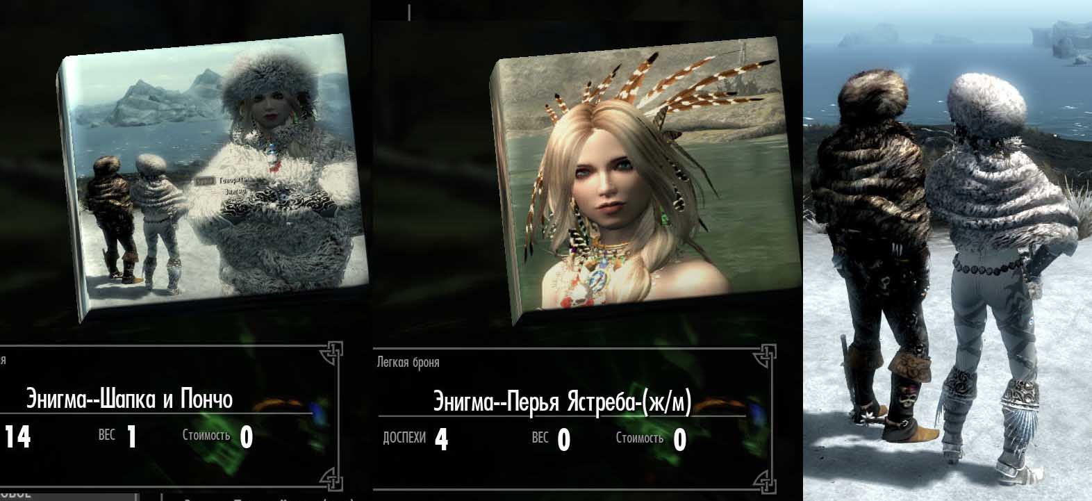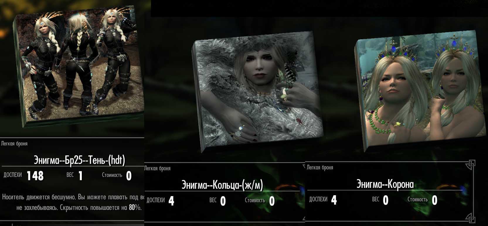 -Для девушек: 12 комплектов одежды-брони, кольца, перья, украшения, диадема. Одежда сделана пакетами, чтоб не путаться. То есть комплект одевается сразу одним кликом, что очень удобно. И ещё. Комплекты в Энигме идут не по номерам, это не ошибка, это если поставить мод Золушка, а это как бы Диптих, то есть Золушка это дополнение к Энигме, то все 32 комплекта будут по номерам. У меня всегда Как в Аптеке.