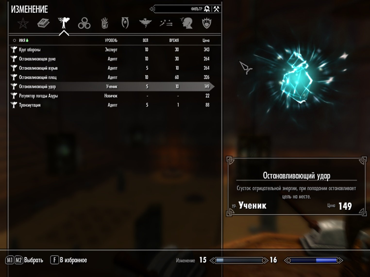 2 - Останавливающий удар: одиночное атакующее заклинание, останавливает врага при попадании.