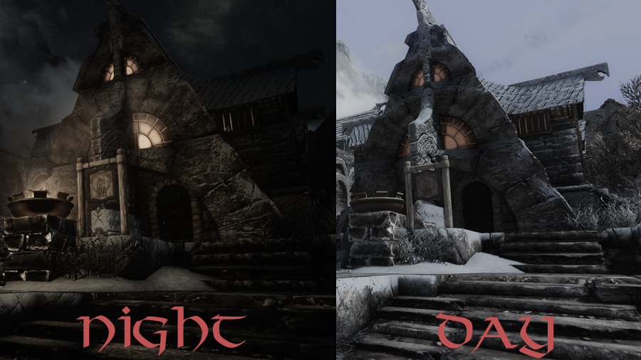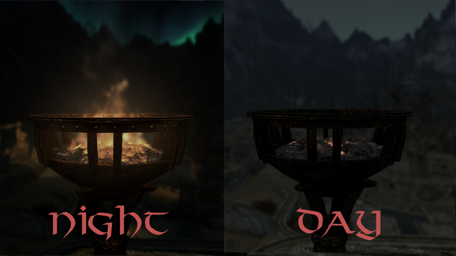 Ночью все огни будут гореть, а днём отключатся. Итак, другими словами автор постарался сделать Skyrim более реалистичным днем и ночью, все источники света гаснут или загораются в определенное время.