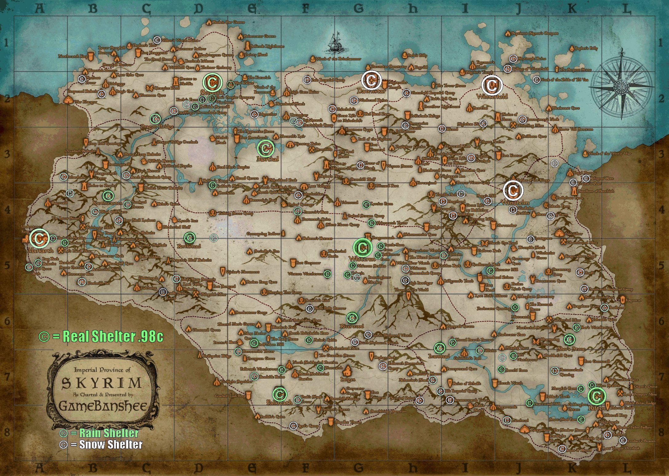 Теперь весь Скайрим и DLC (Dawnguard, Dragonborn, Hearthfire) поддерживаются модом, укрытия созданы как в самой провинции, так и в Солстейме. Всего мод добавляет сотни областей с укрытиями, включая палатки.