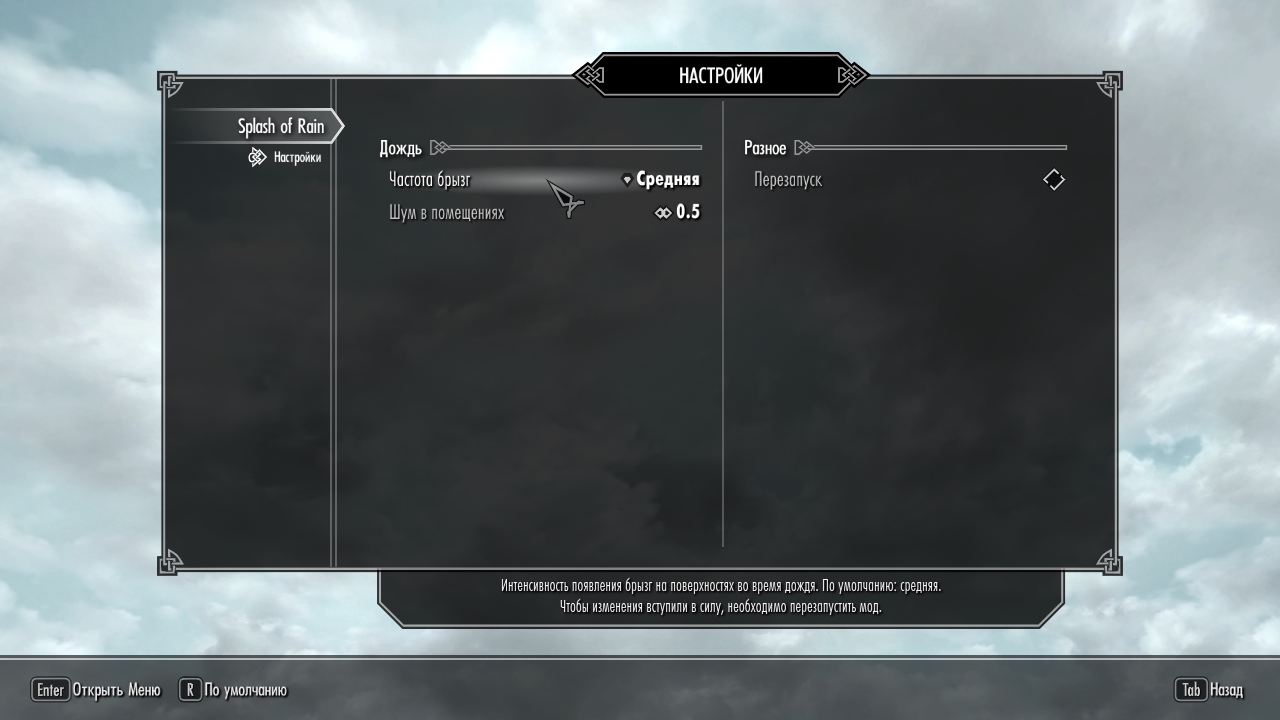 Пользователям SkyUI будет доступна настройка уровня интенсивности брызг, громкость звукового эффекта в помещениях (с флагом LocTypeDwelling), а также возможность перезагрузки модификации.