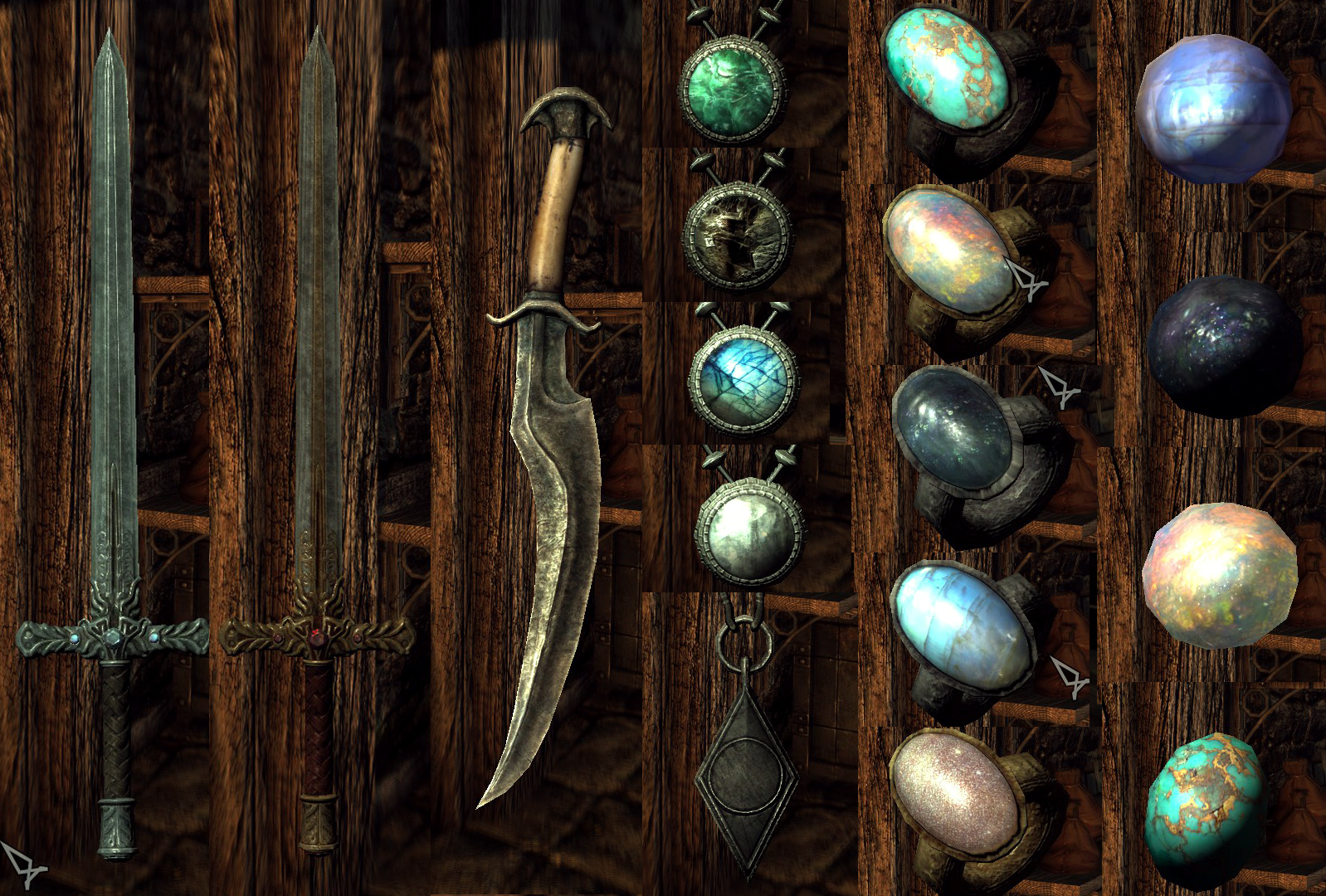 - Множество предметов для кражи, включая множество новых драгоценных камней (опалы, лунные камни т.д), а также новые драгоценности и декоративные мечи. Все эти предметы помещены в левел-листы, так что вы будете их время от времени находить. Суть в том, чтобы добавить смысла в проникновение домов дворян.